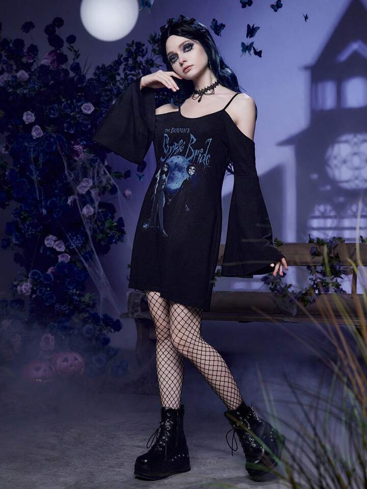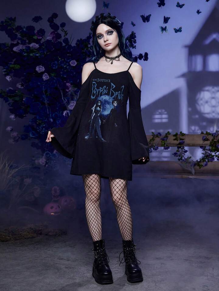 Corpse Bride | ROMWE Letter Figure Graphic Cold Shoulder Dress