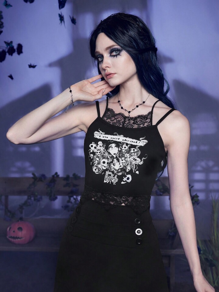 Corpse Bride | ROMWE Slogan Skull Print Contrast Lace Cami Top