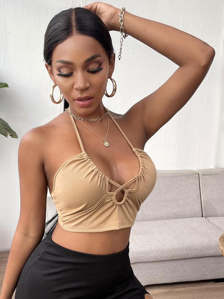 Crisscross Cut-out Tie Back Rib-knit Halter Top