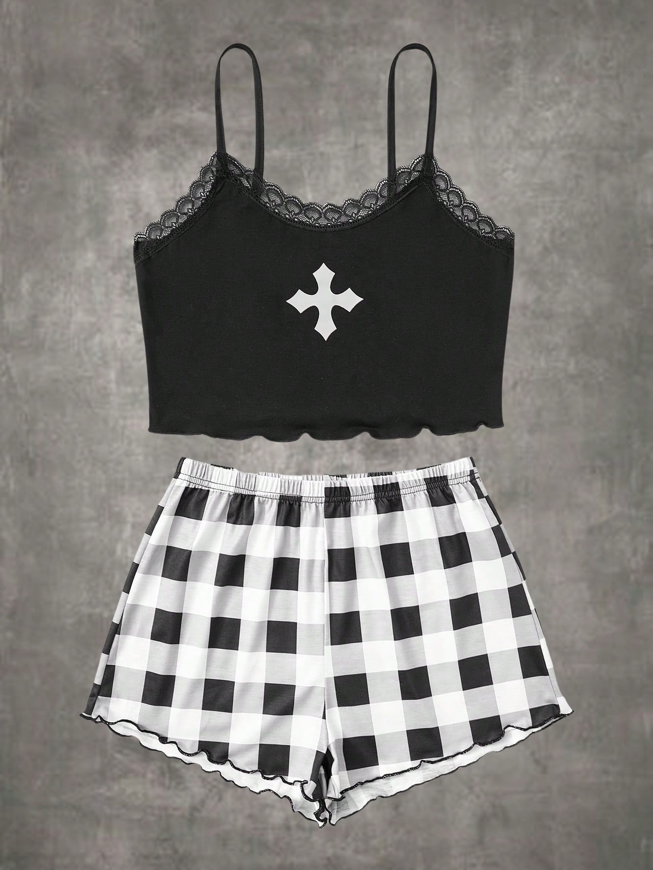 Cross Graphic Plaid Contrast Lace Lettuce Trim PJ Set