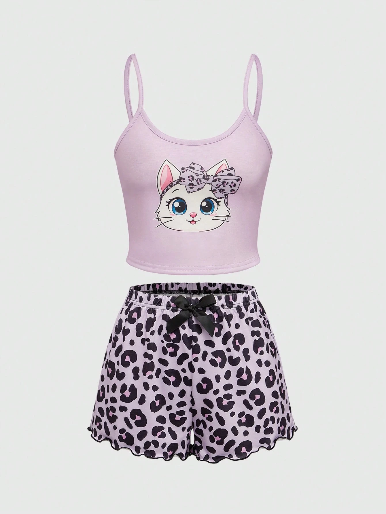 Cute Kawaii Leopard Print Cat Pattern Camisole & Shorts Sleepwear Loungewear Set With Bow