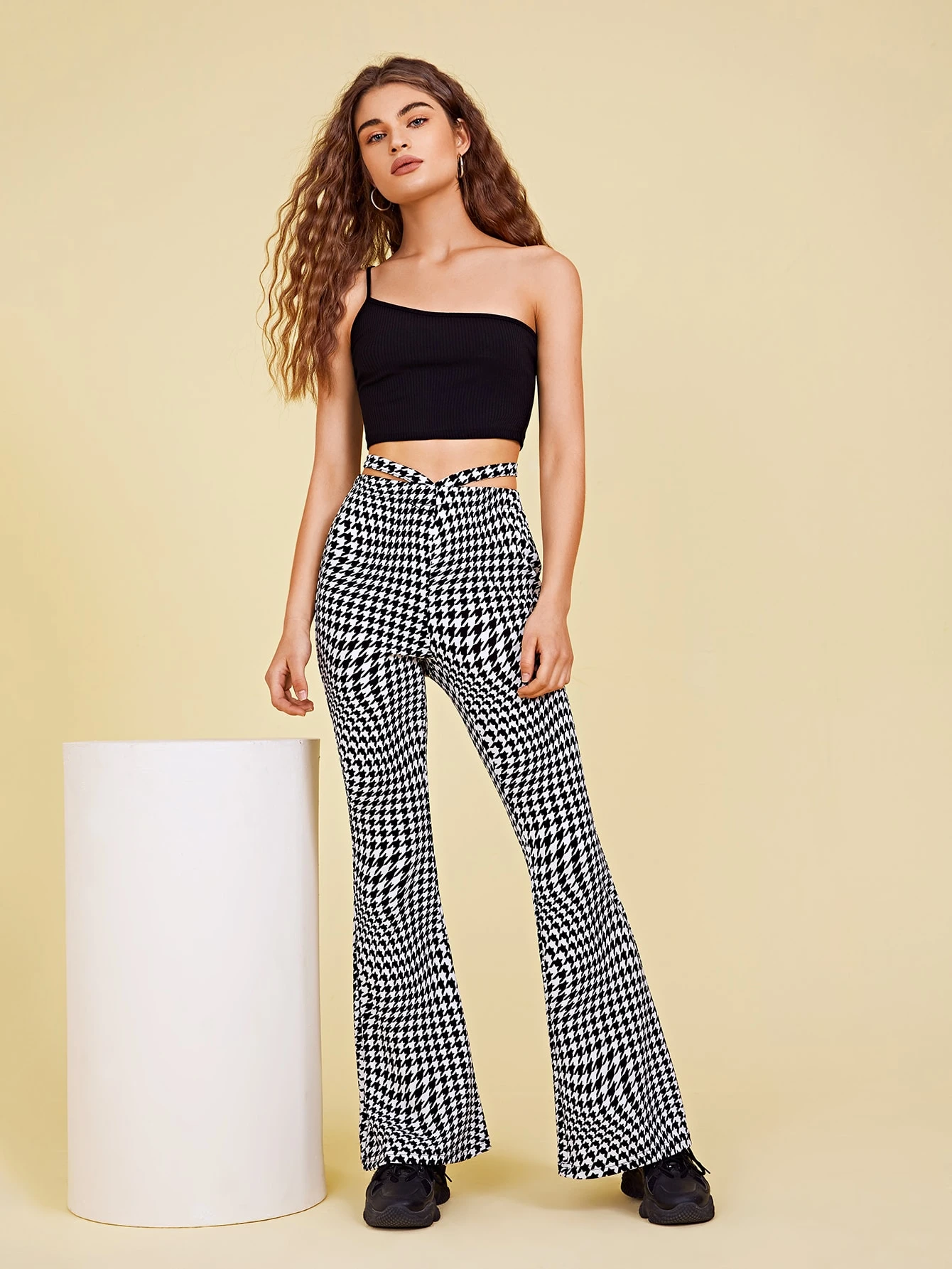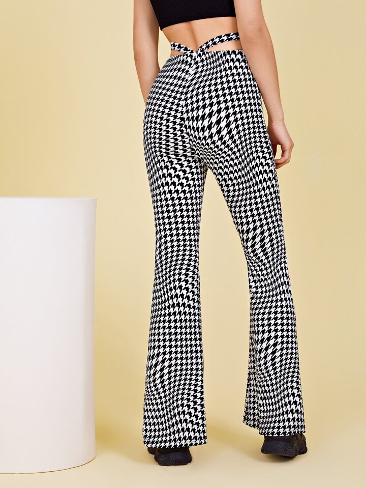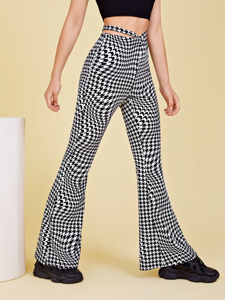 Cutout Waist Flare Leg Houndstooth Pants
