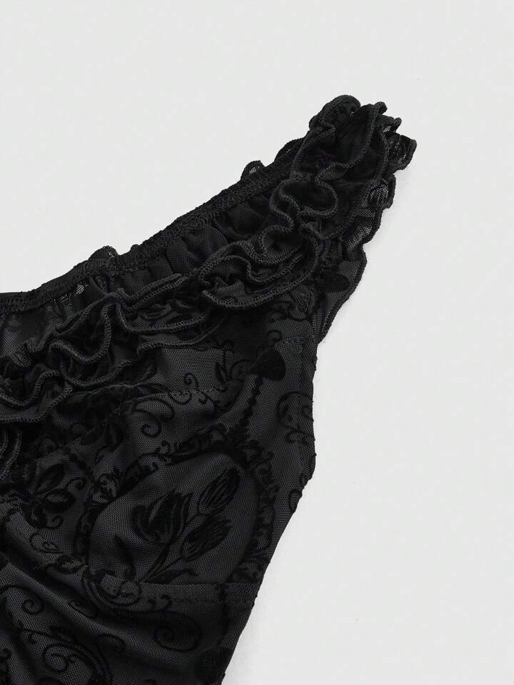 Dark Gothic Punk Cross Net Yarn Raised Flocked Off Shoulder Ruffle Trim See-Through Women T-Shirt