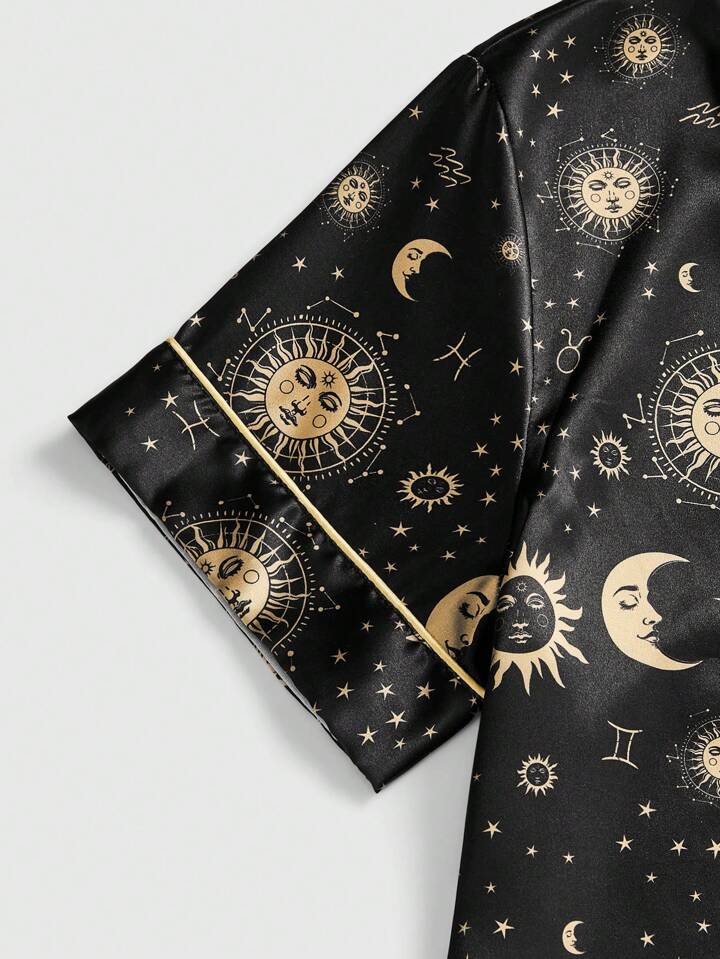Dark Gothic Sun, Moon & Star Print Satin Button-Up Shorts Pajama Set