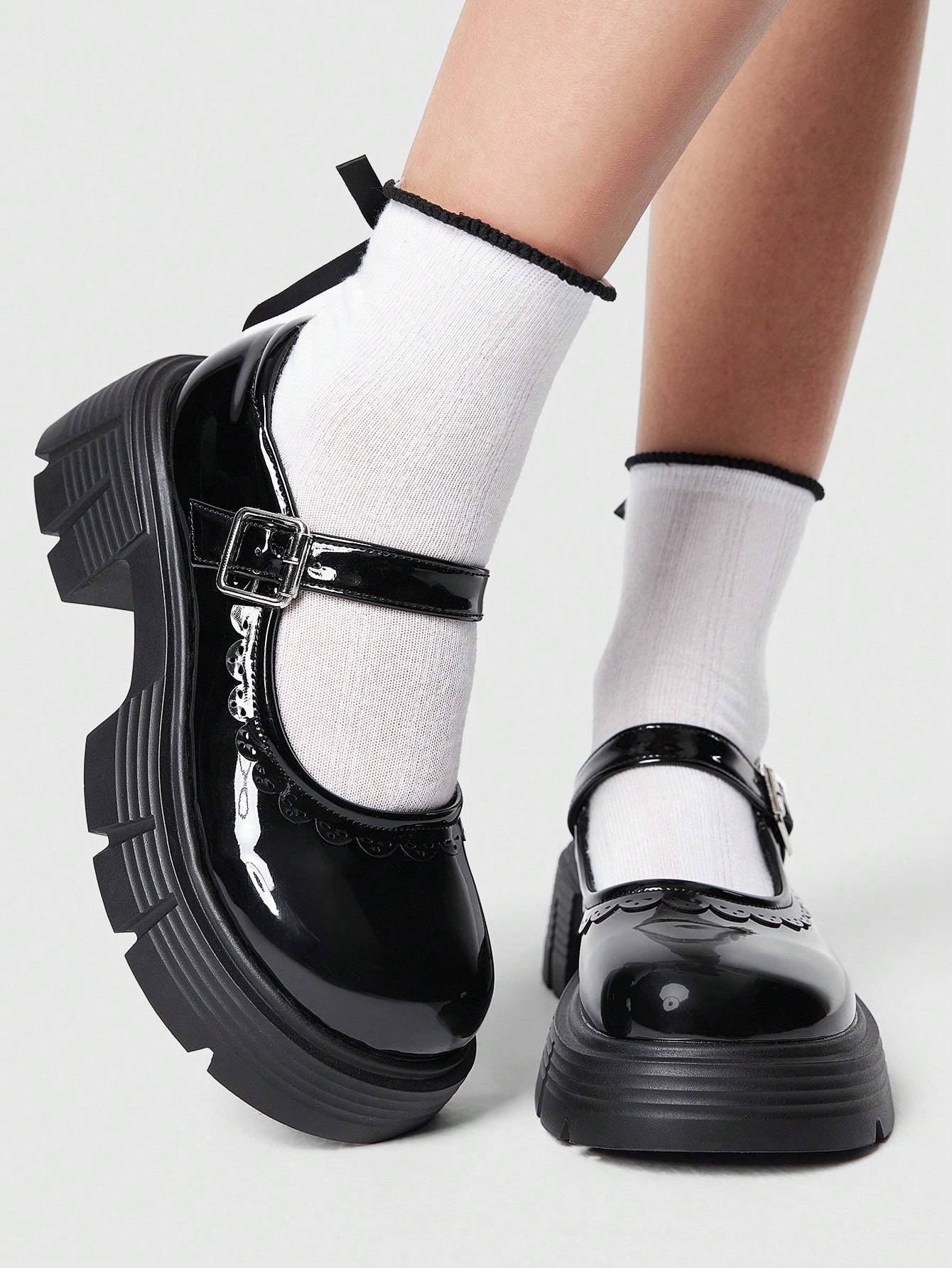 Dark Gothic Sweet Thick Sole Chunky Heel Retro British Style Mary Jane Shoes With Lace Trim, Strap & Metal Buckle, Versatile, French/Japanese School Girl Style