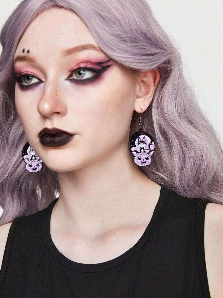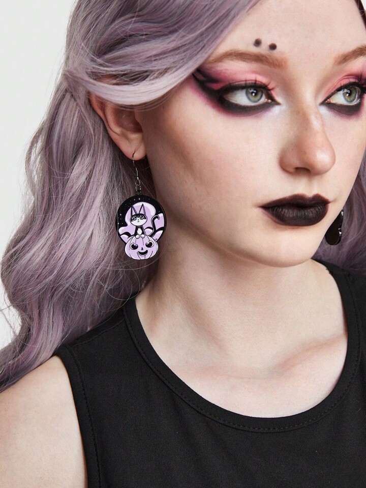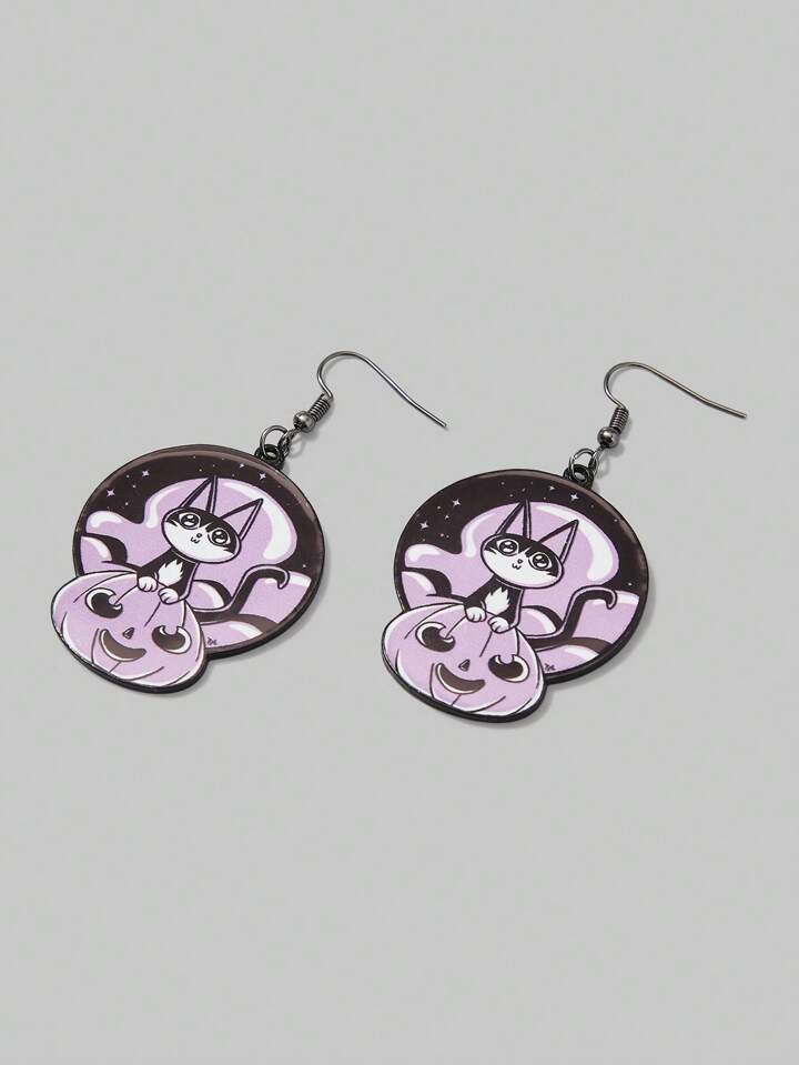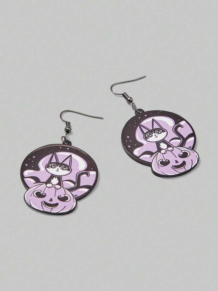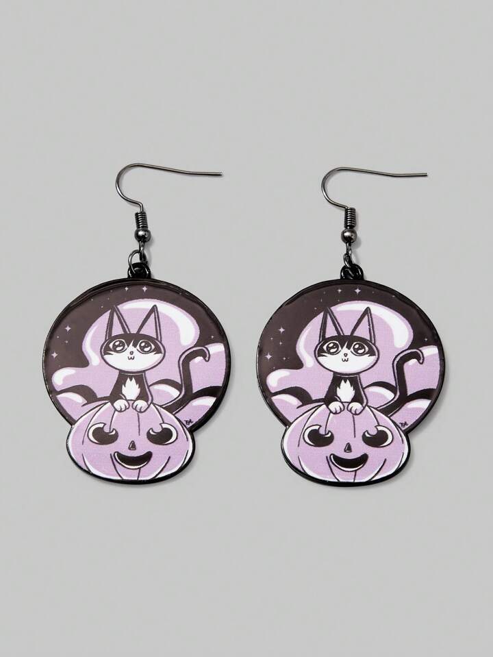 Dark but Cute 1pair Gothic Style, Dark Themed, Halloween Cat & Demonic Pumpkin Design Pendant Earrings