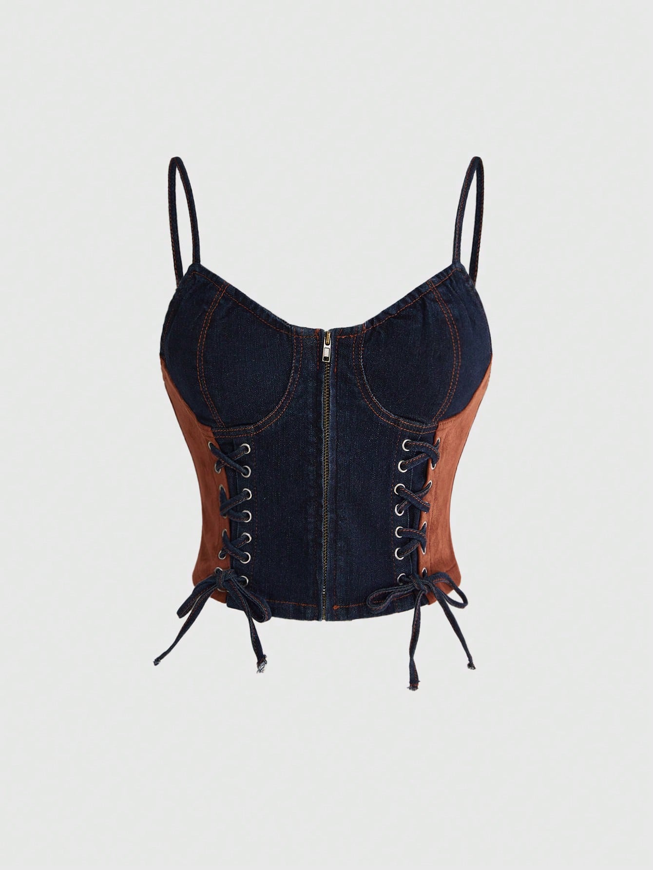 Denim Patchwork Suede Hippie Music Festival Tie-Up Crafted Women Denim Top