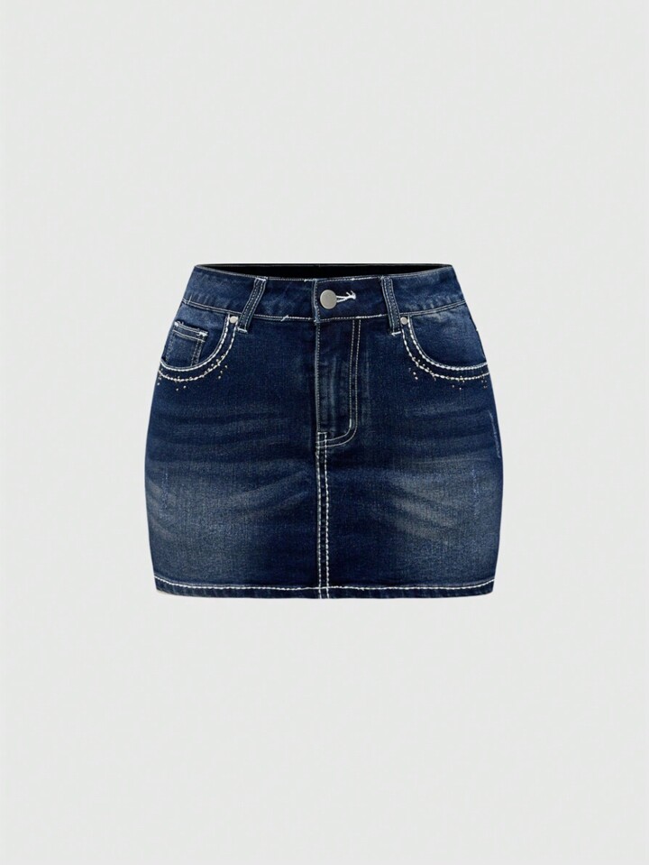 Distressed Vintage Low Waist Thick Stripe Contrast Cross Rhinestone Embellished Women's Denim Skirt