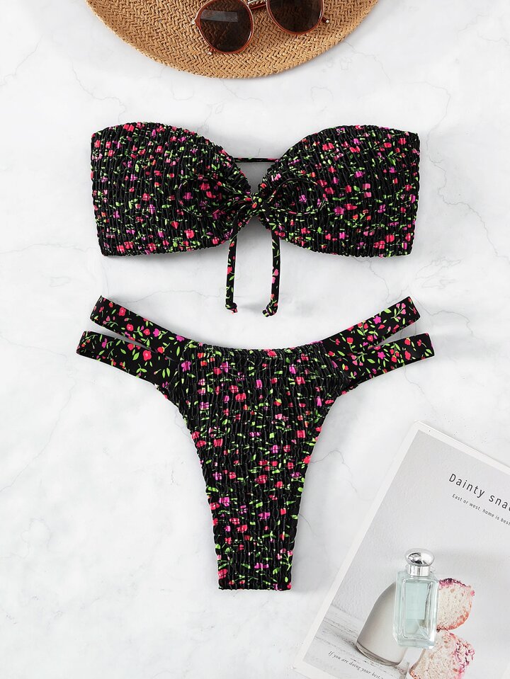 Ditsy Floral Knot Front Bandeau Summer Beach Bikini Set
