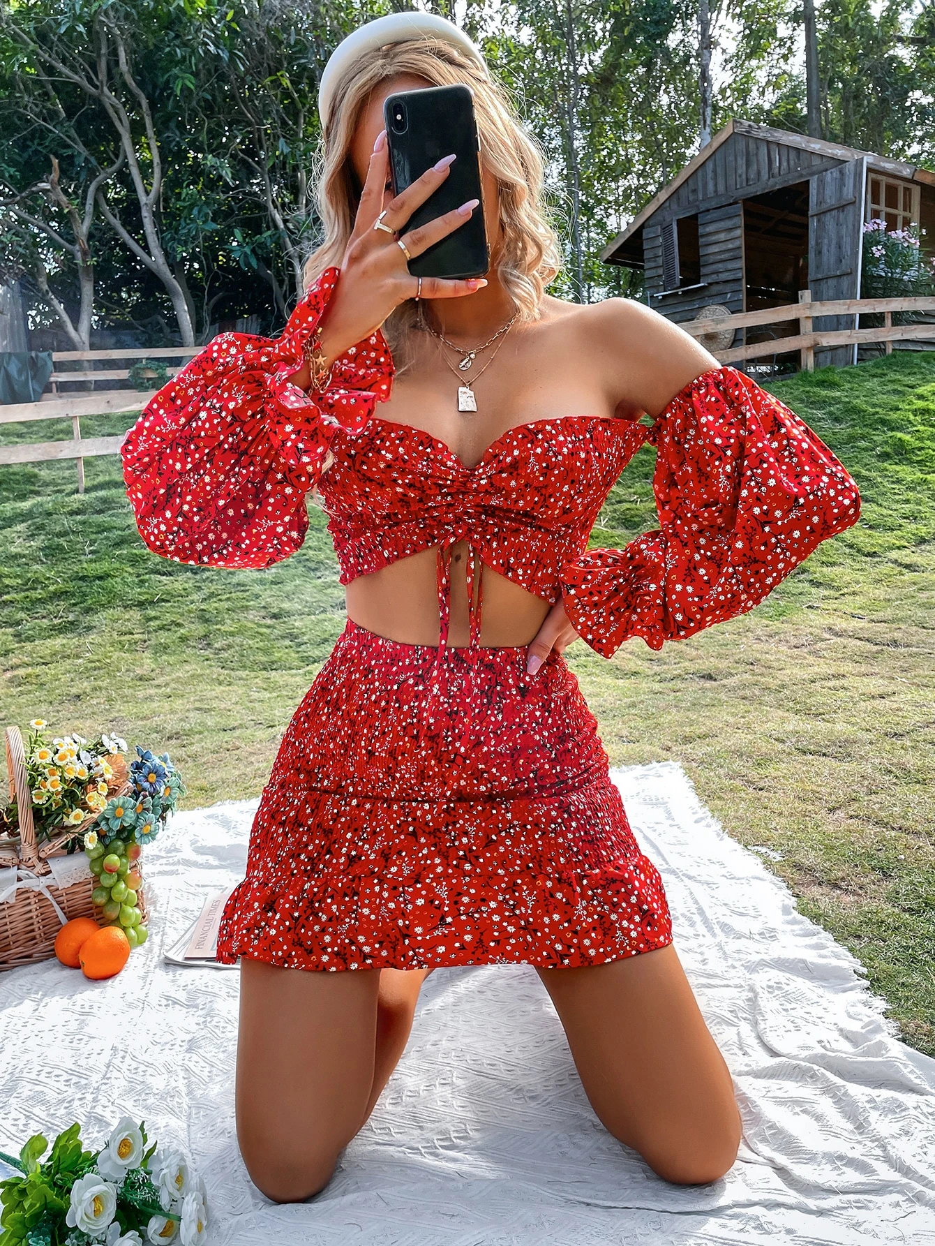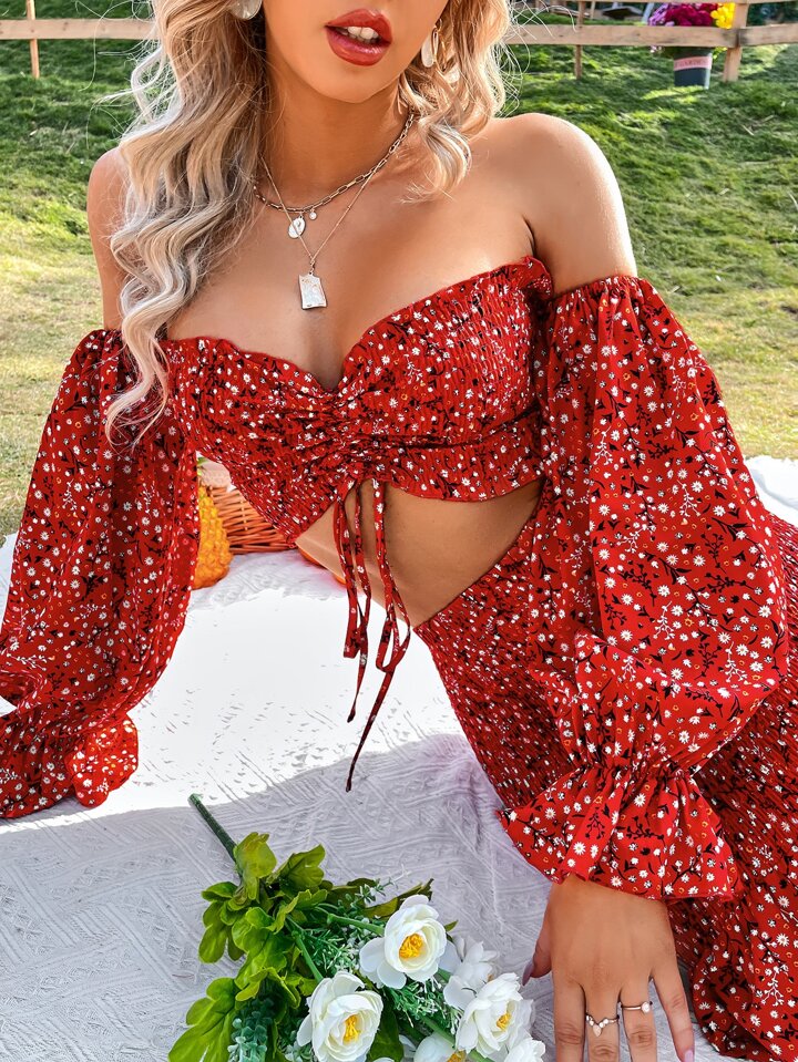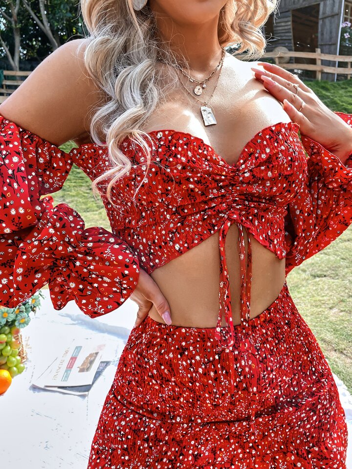 Ditsy Floral Off Shoulder Flounce Sleeve Drawstring Crop Top