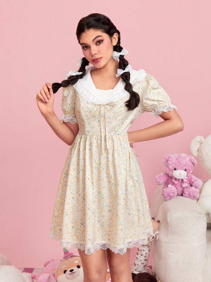 Ditsy Floral Print Contrast Lace Puff Sleeve Dress