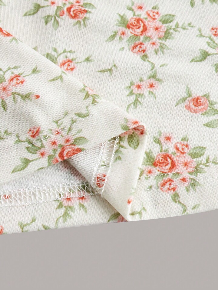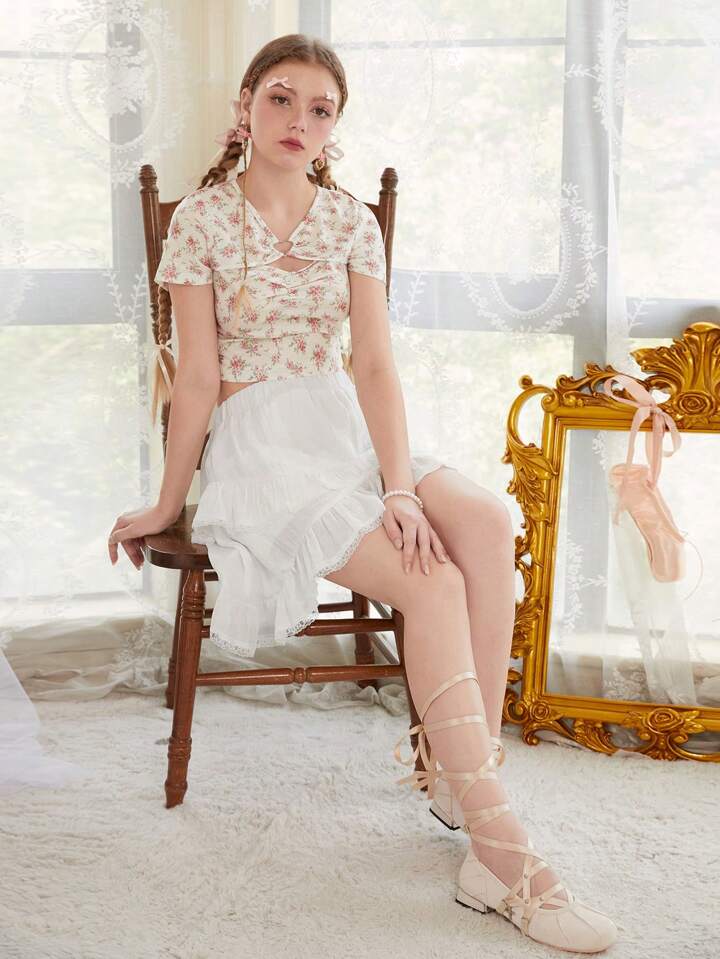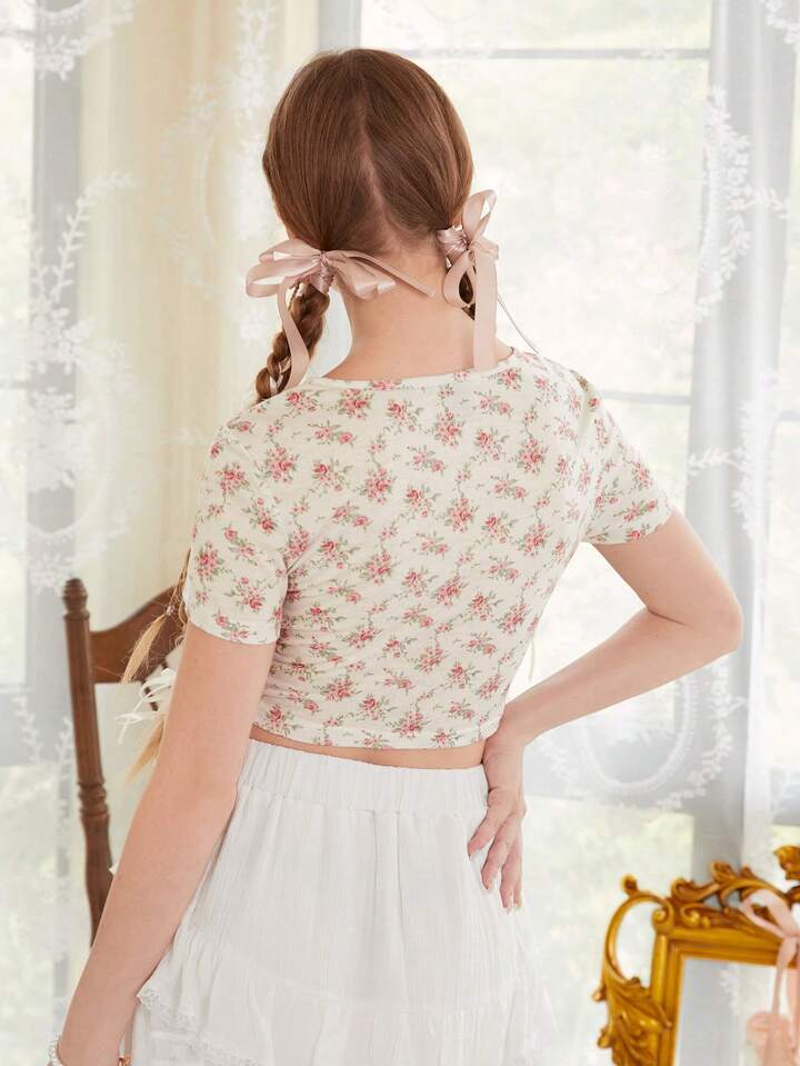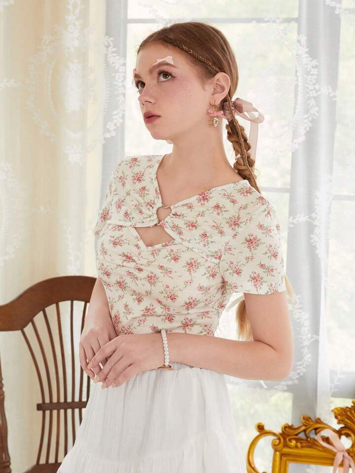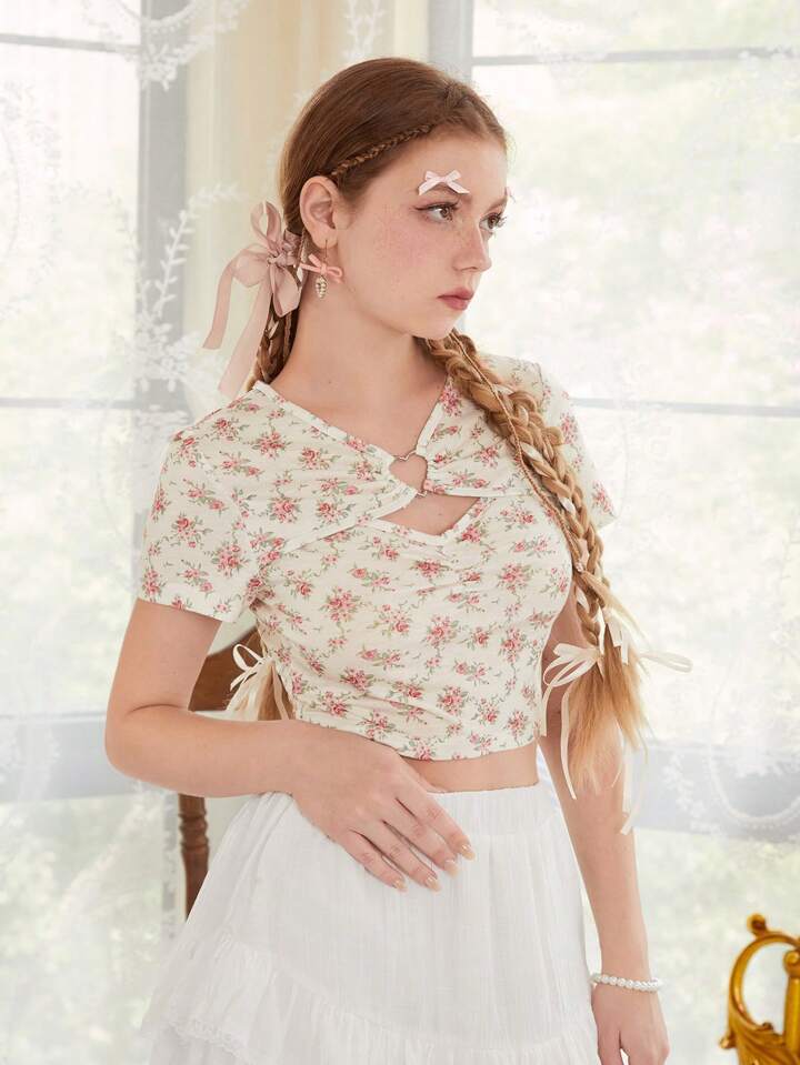 Ditsy Floral Print Ring Linked Cut Out Front Crop Tee