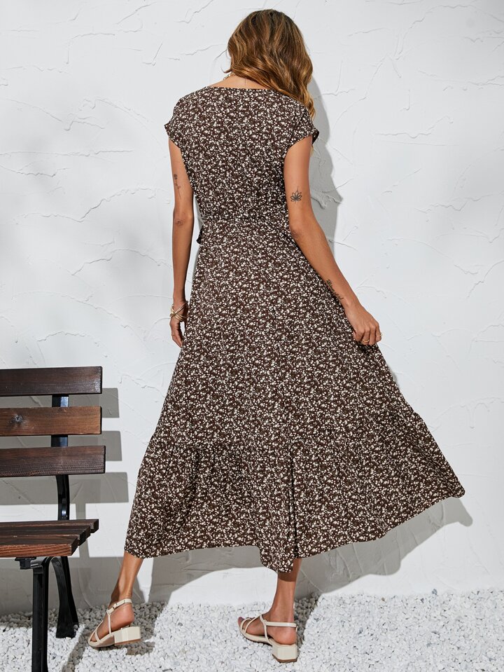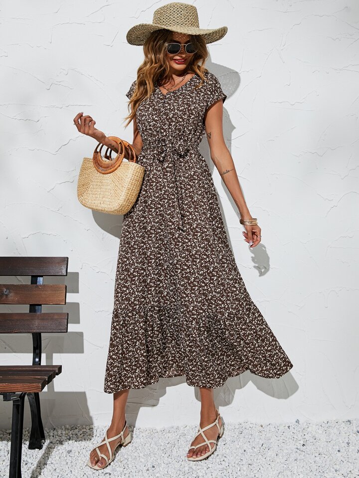 Ditsy Floral Print Ruffle Hem Belted A-line Dress