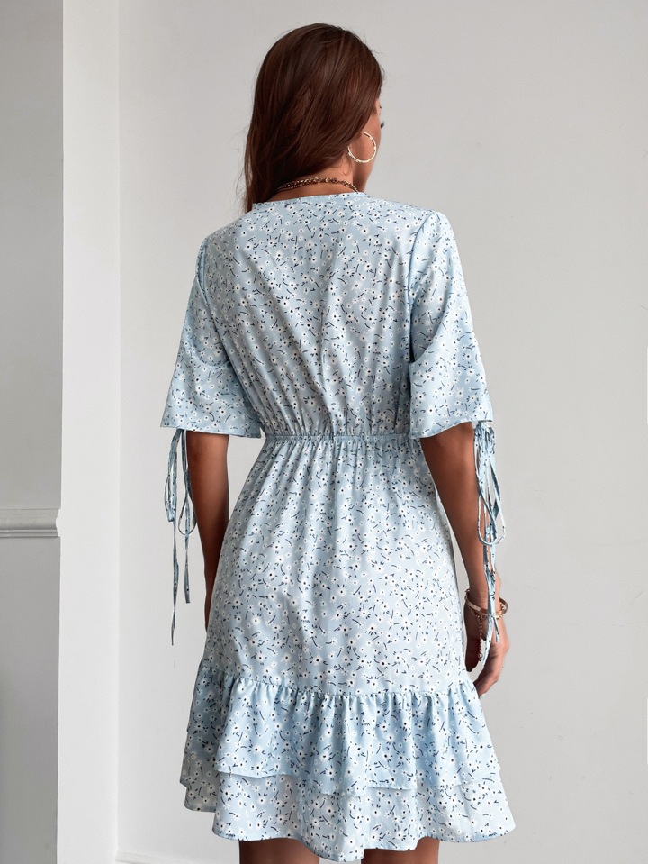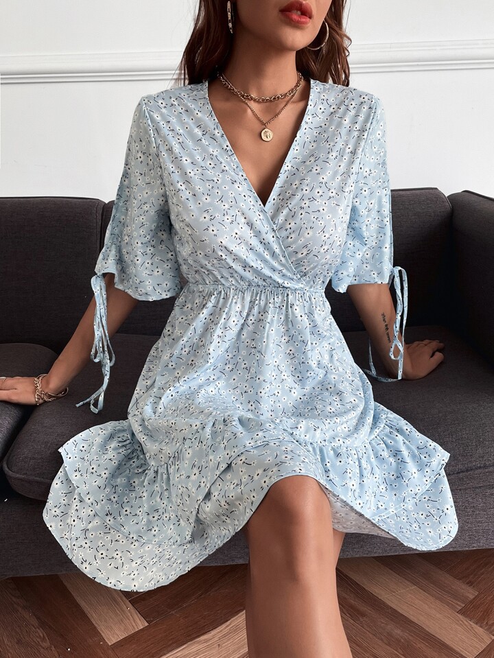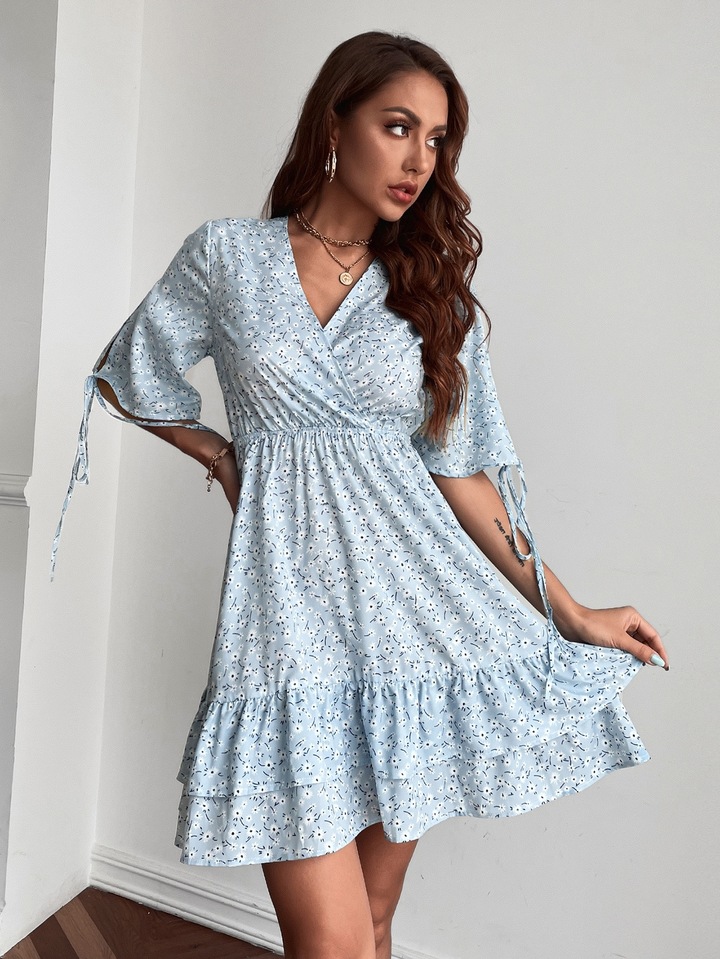 Ditsy Floral Surplice Neck Layered Hem A-line Dress