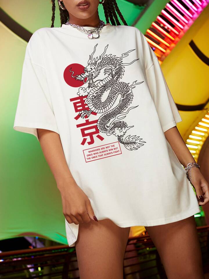 Drop Shoulder Chinese Dragon Print Oversized Tee