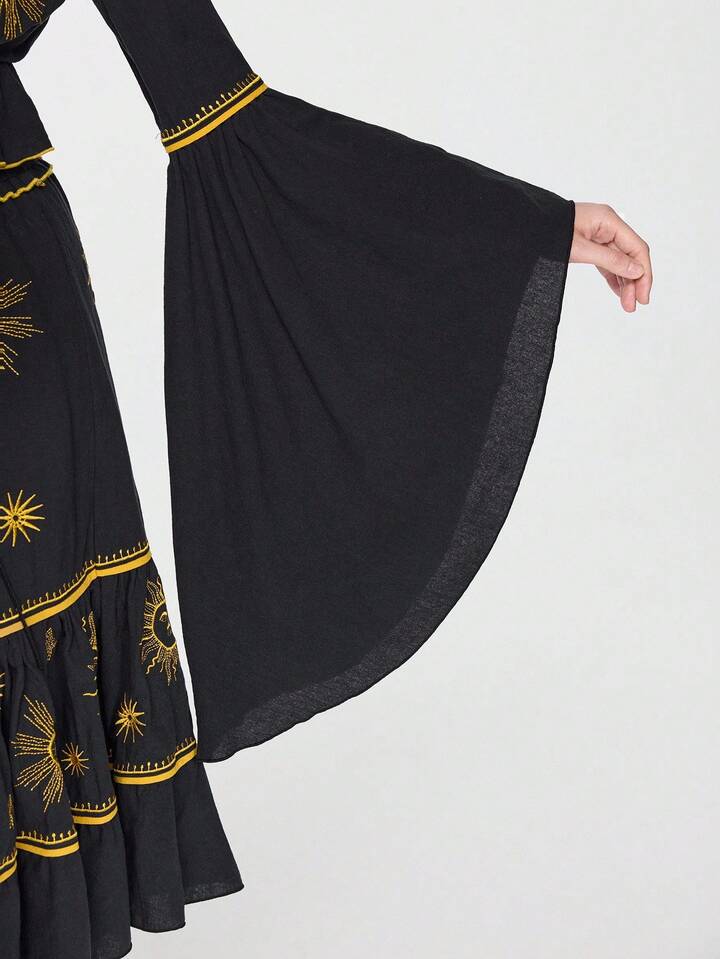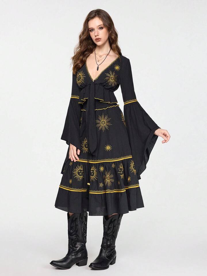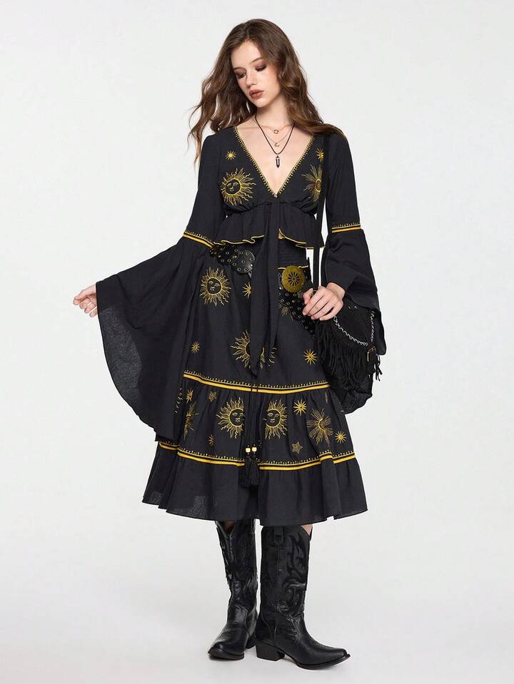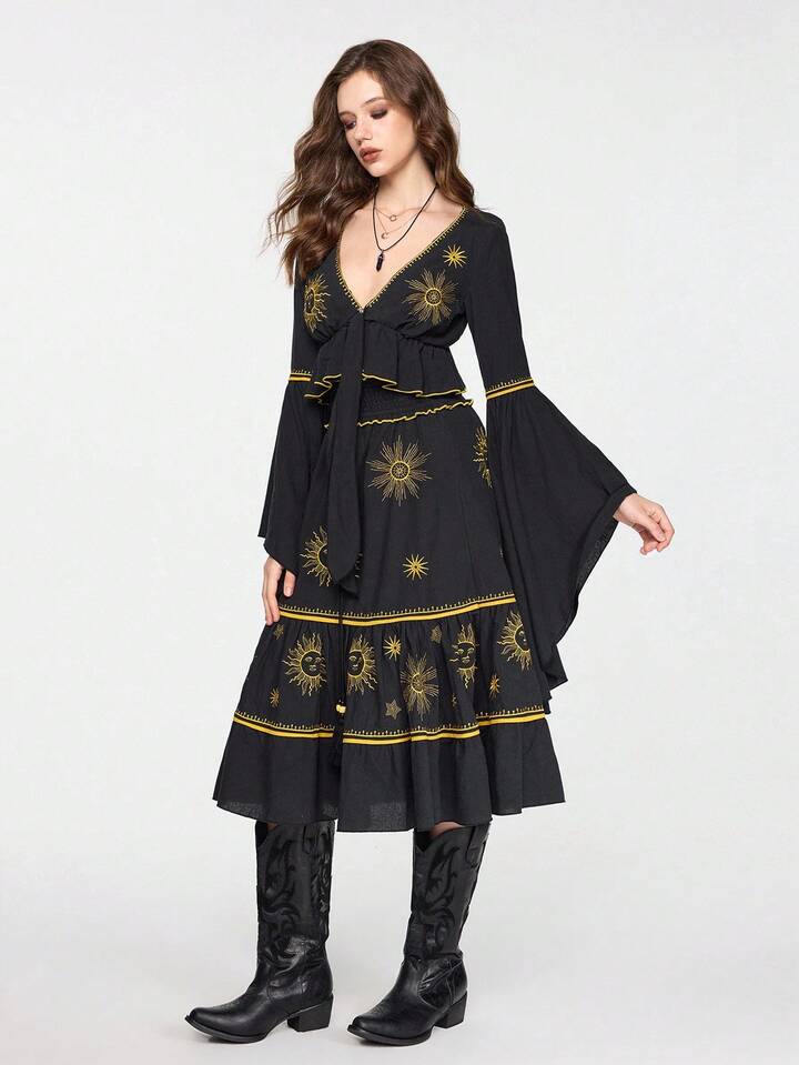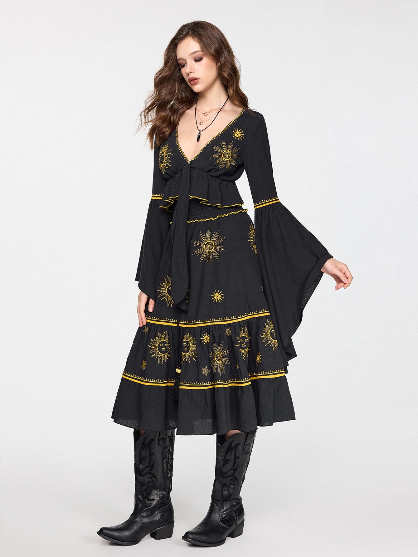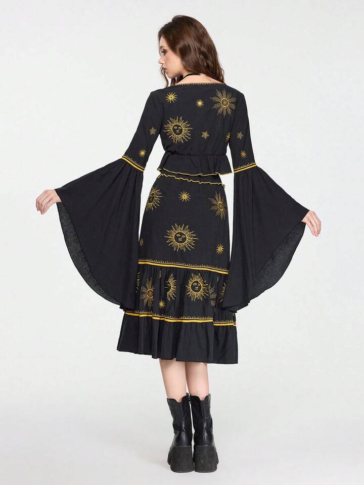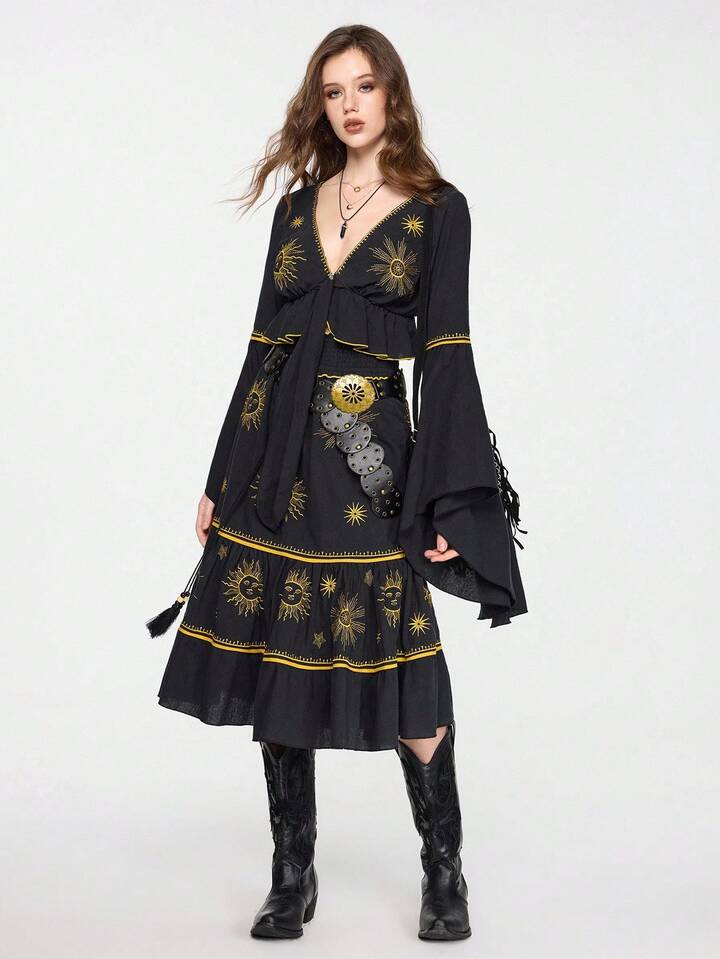 EDITION 2pcs/Set Casual Vacation Mysterious Star & Moon Embroidery Top And A-Line Skirt Set For Women