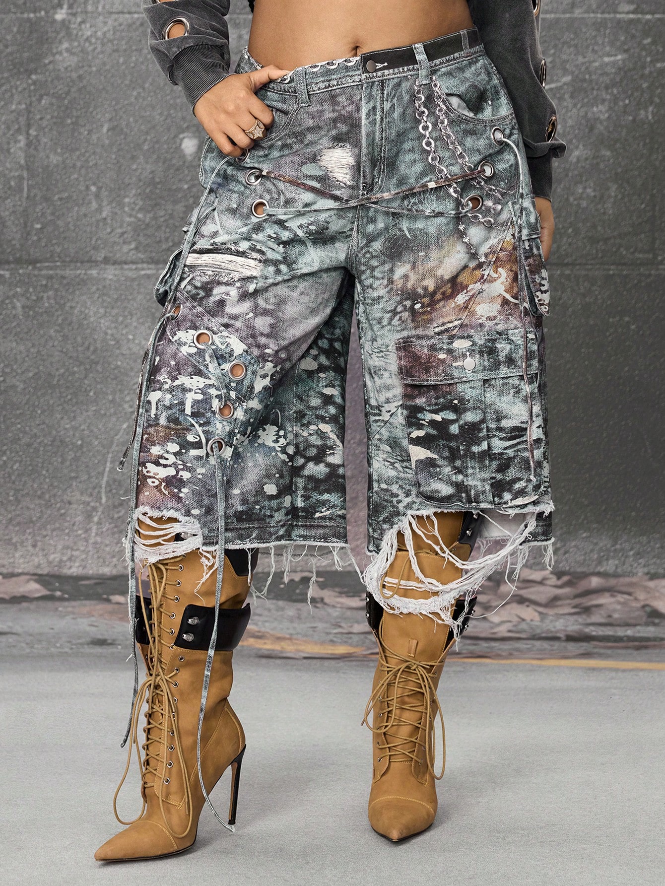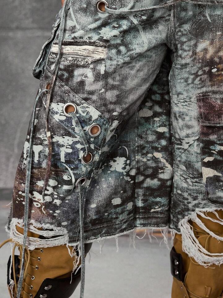 EDITION Plus Size Street Punk Heavily Distressed Print Loose Women Denim Bermuda Shorts