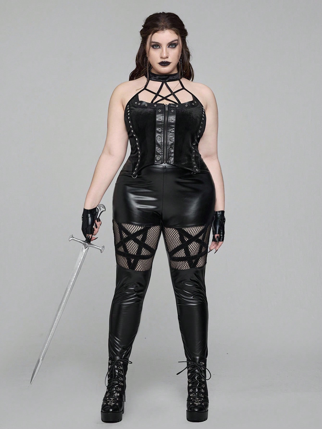 EDITION Plus Size Women Gothic Style Pentagram Mesh Patchwork PU Fabric Skinny Stretch Pants