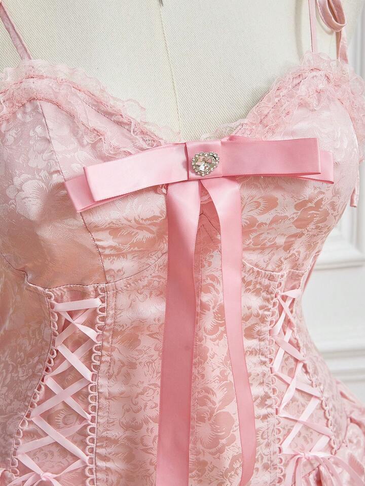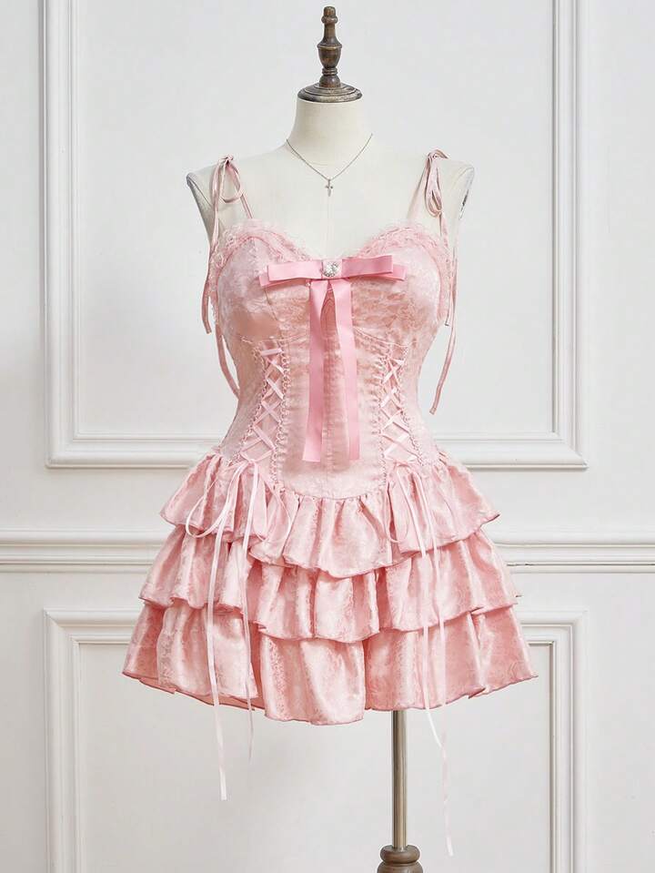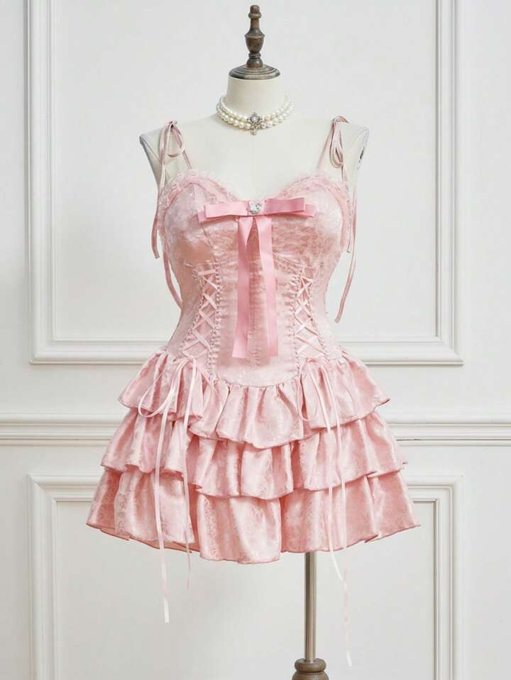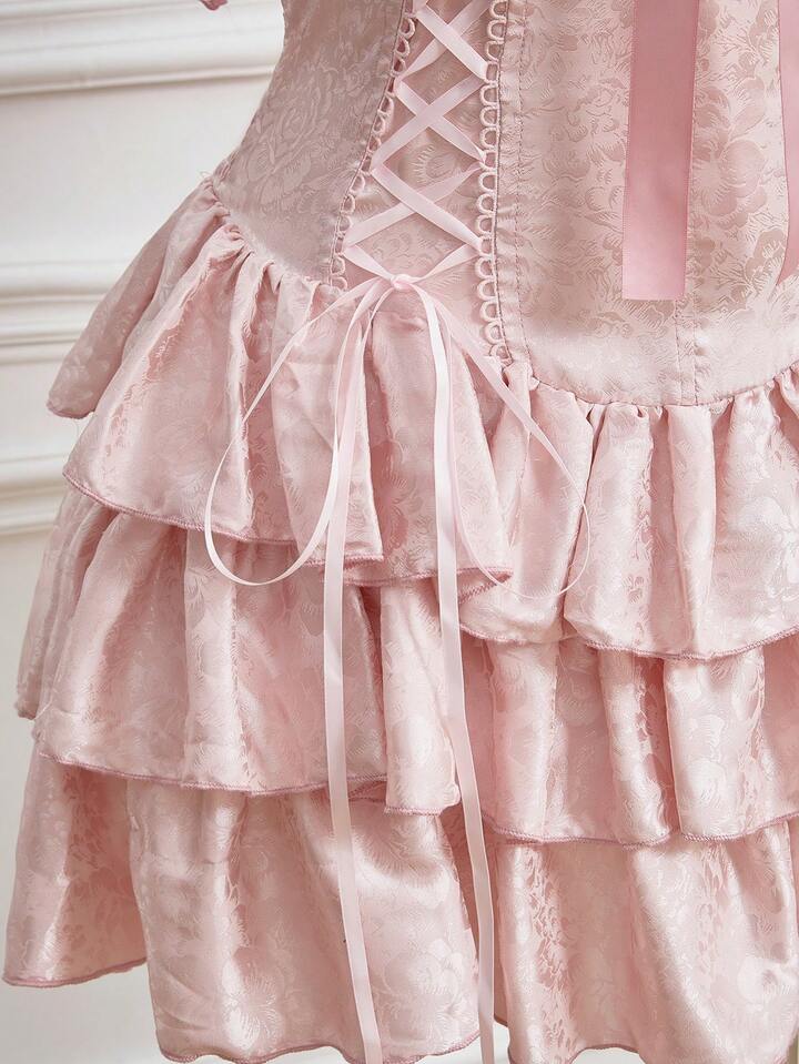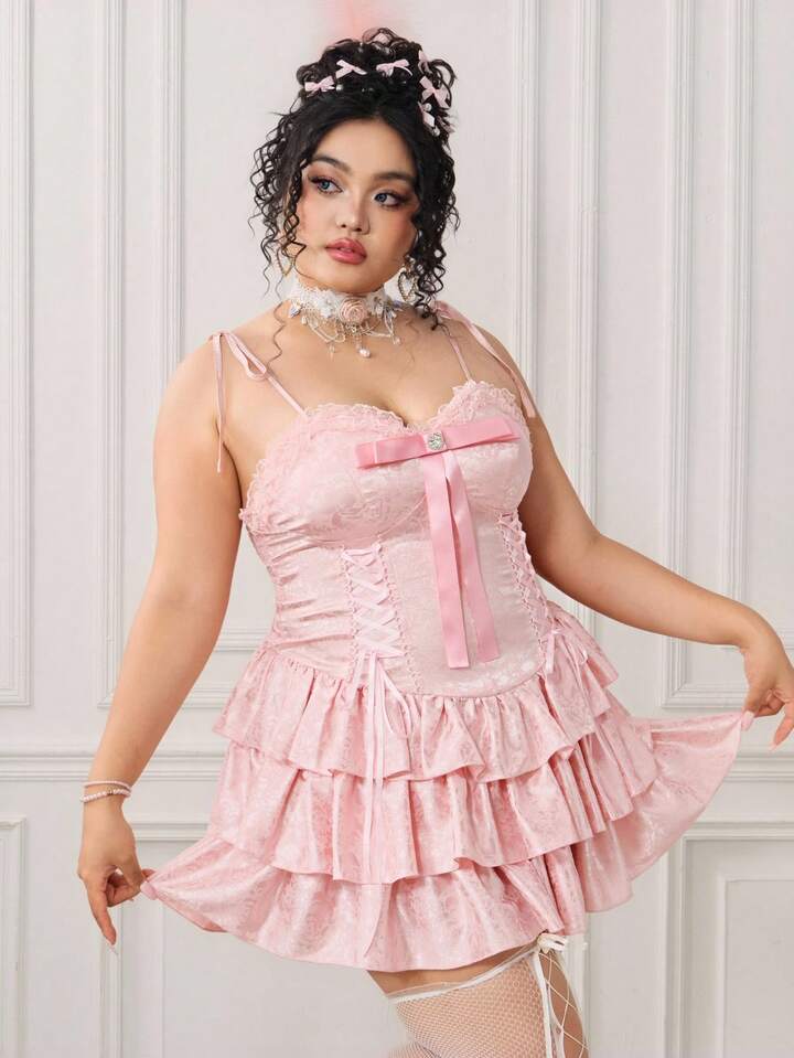 EDITION Plus Size Women Vintage Palace Romantic Pure Ribbon Bow Decor Layered Ruffle Hem Mini Dress