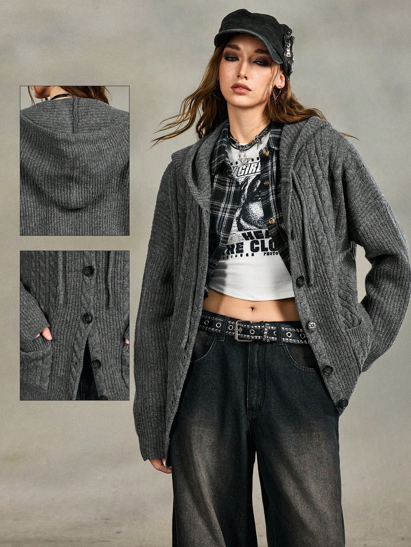 EDITION Vintage Loose Fit Gray Cable Knit Hooded Cardigan For Women, Thick Warm Sweater Jacket, Versatile Top For Autumn/Winter