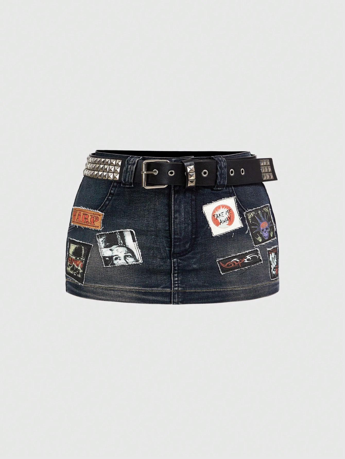 EDITION Vintage Punk Embroidered Distressed Low Waist Tight Mini Denim Skirt