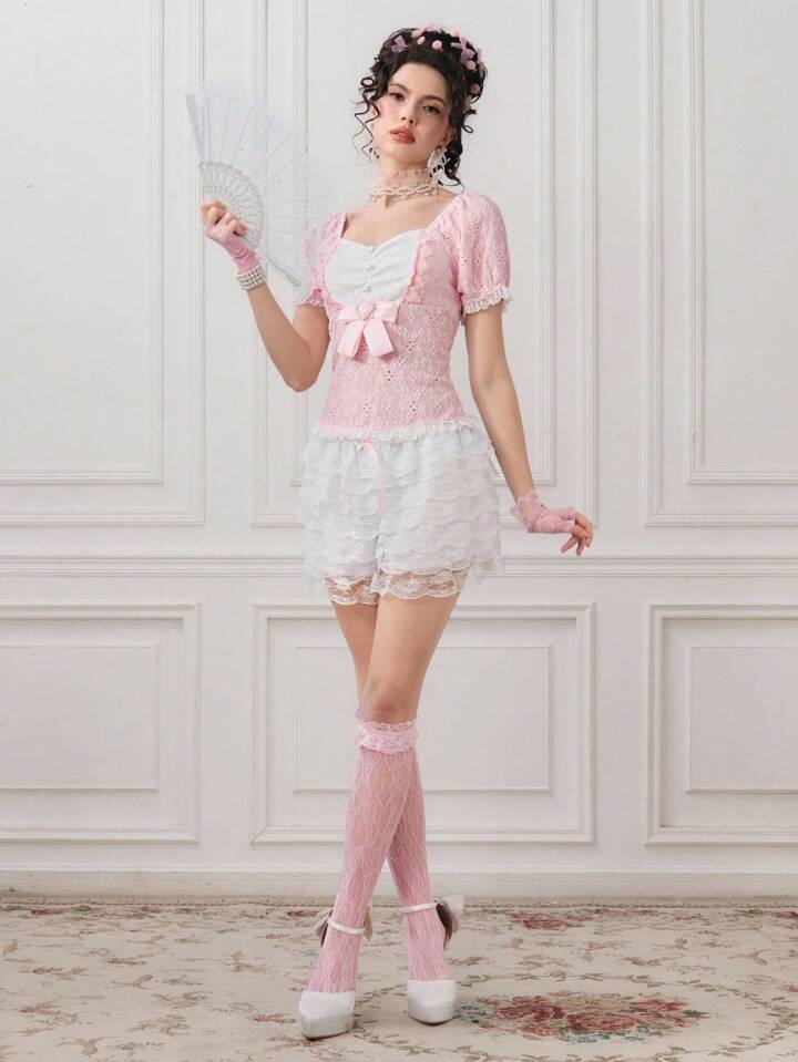 EDITION Women's Cute Girl's Knitted Textured Printed T-Shirt With Lace Bow Trim