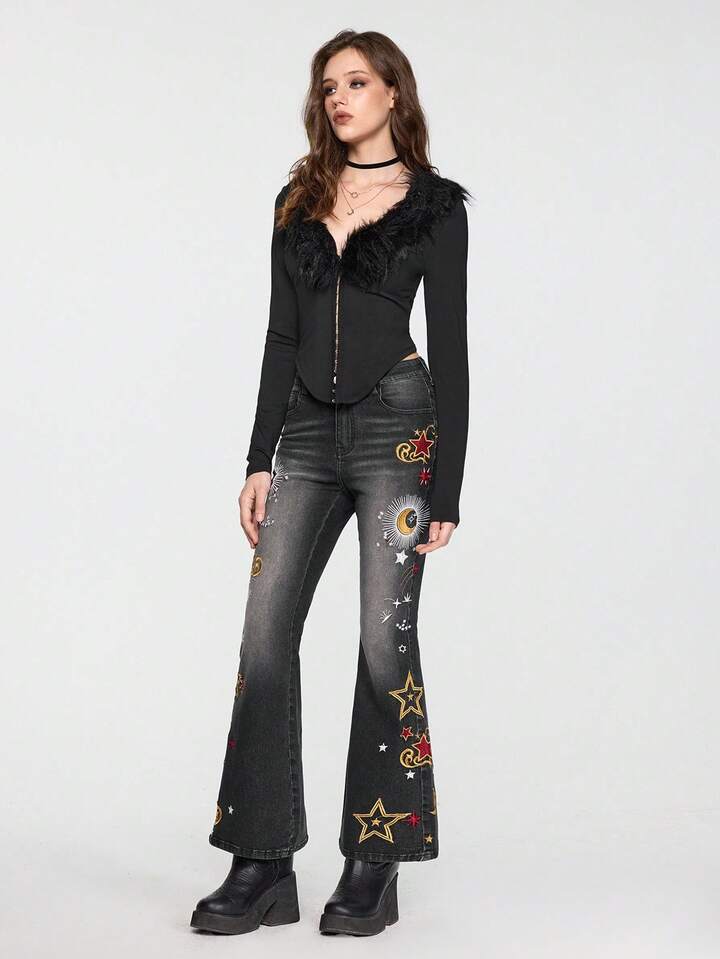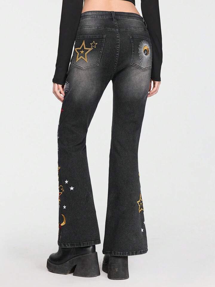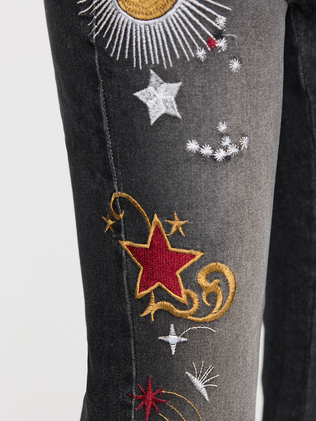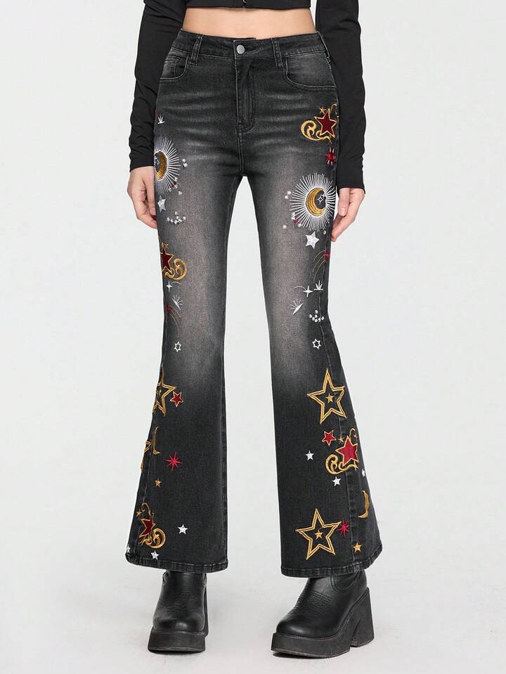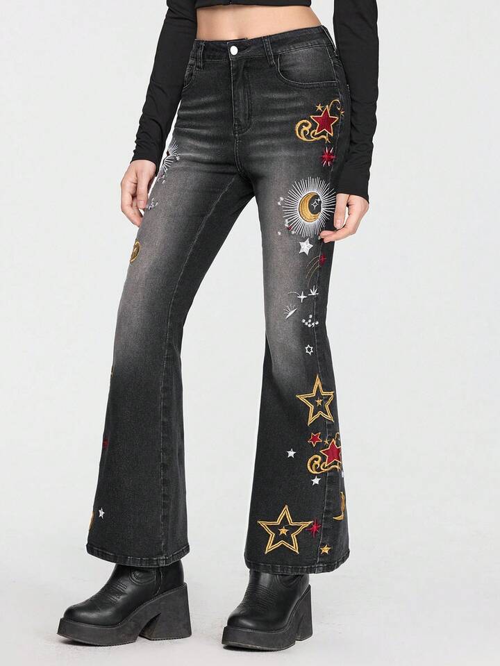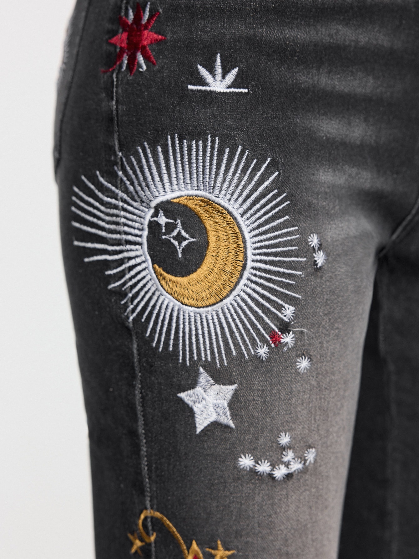 EDITION Women's Halloween Moon & Star Embroidered Mysterious Denim Jeans