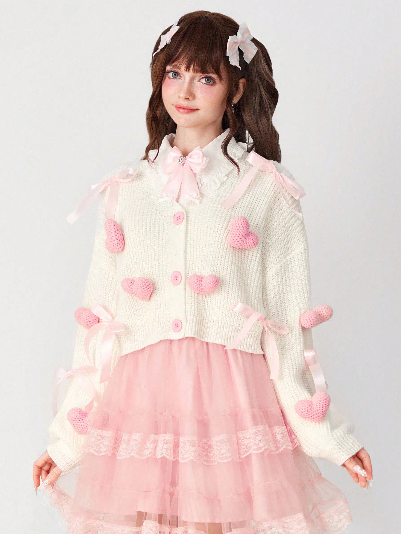 EDITION Women's Pink 3D Heart & Bow Ribbon Decor Cute Girlish Knit Cardigan