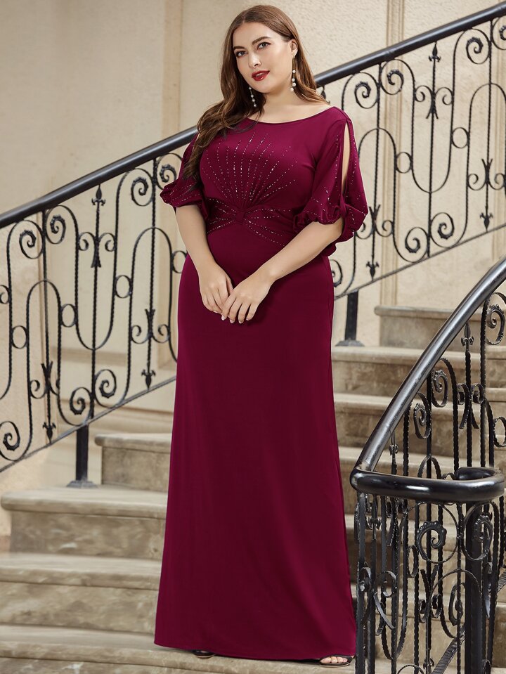 EVERPRETTY Plus Split Sleeve Rhinestone Ruched Prom Dress