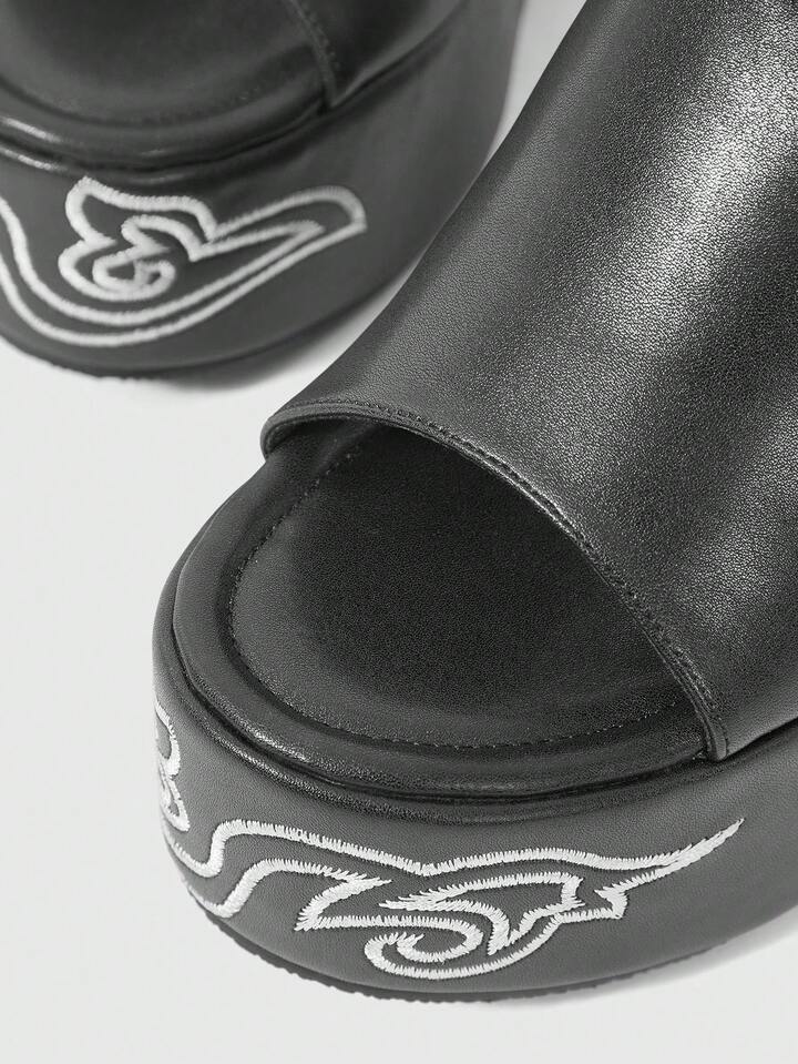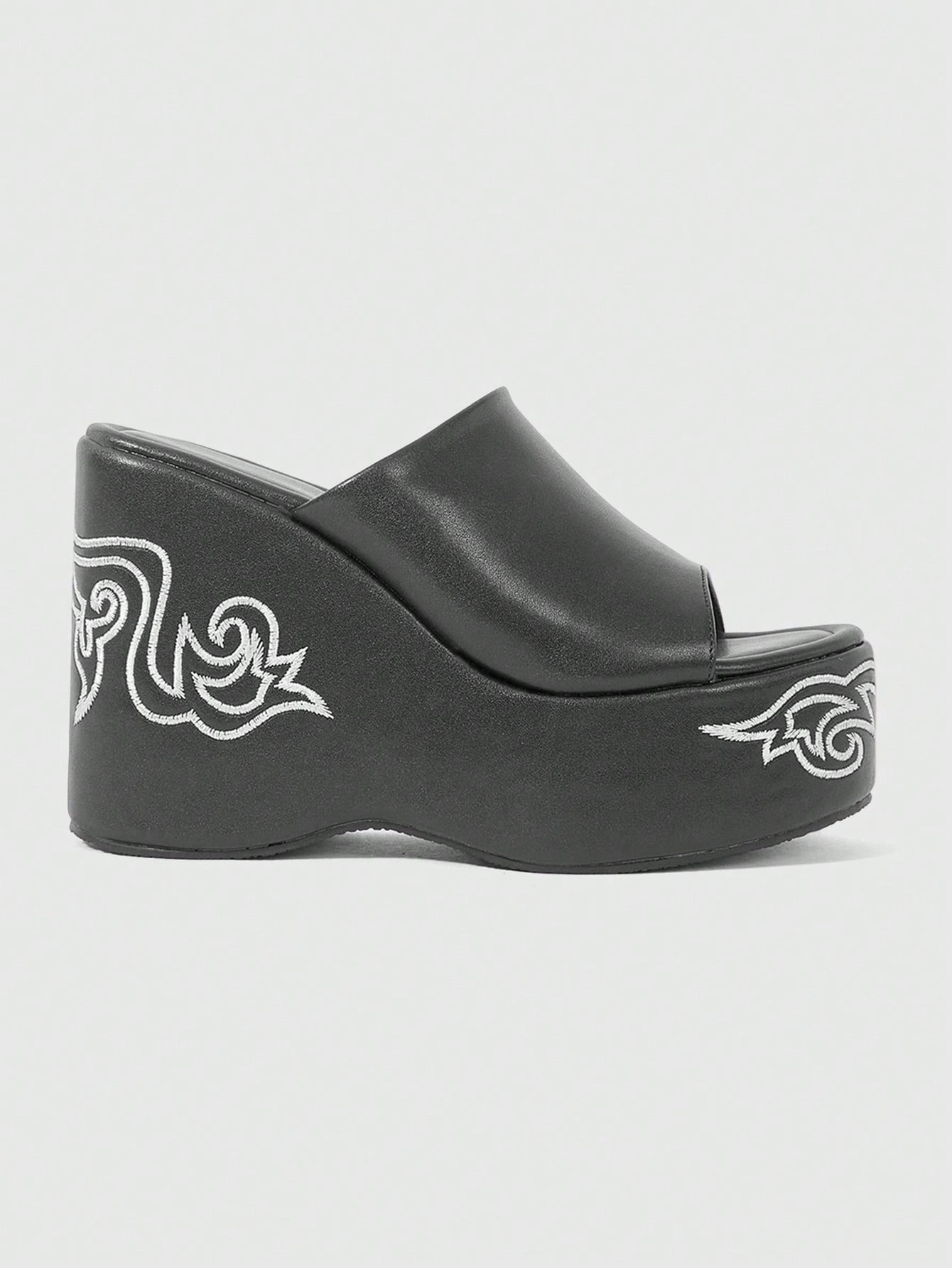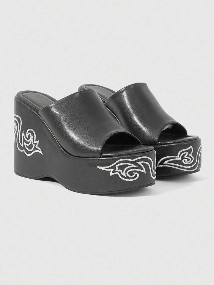 Embroidered Round Toe Wedge Heel Platform Goth Punk PU Leather Black Wedged Sandals For Casual Street Wear, Halloween