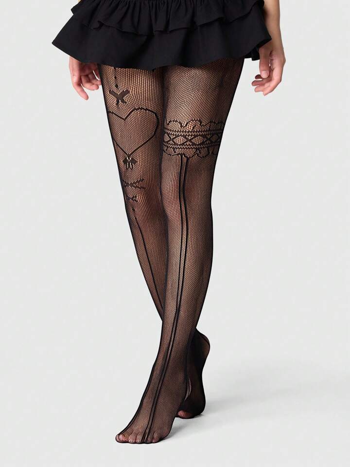 Fairycore 1 Pair Women Black Heart Net Mesh Fishnet Stockings, Suitable For All Seasons