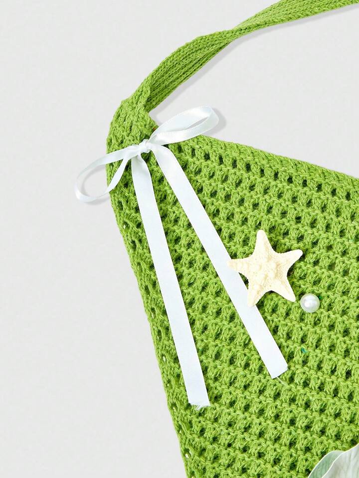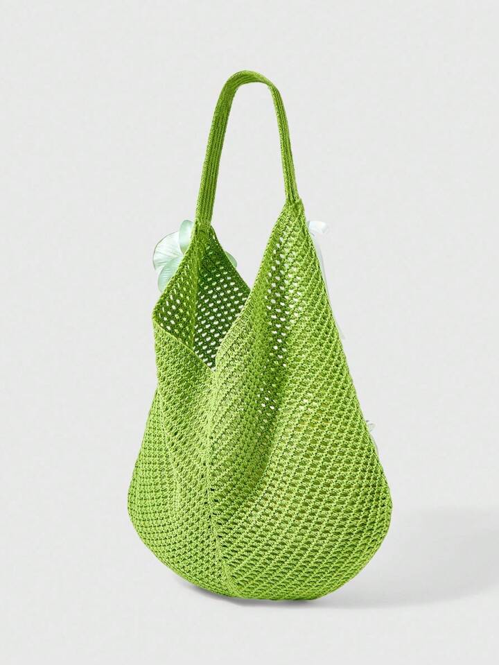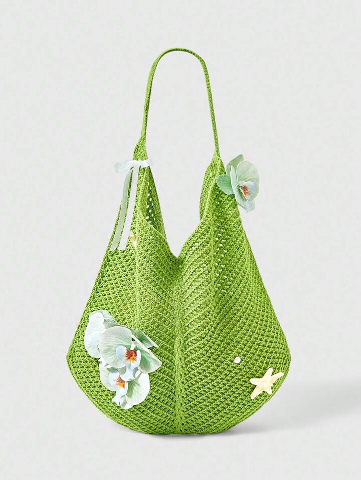 Fairycore 1 Set Green Woven Beach Tote Bag & Accessory, Fashionable Personalized Beach Holiday Style Women's Tote Bag (Includes 1 Bag And 1 Set Of Accessories)