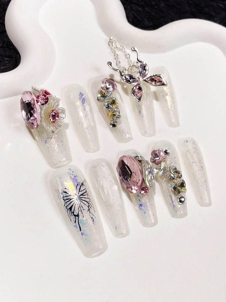 Fairycore 10pcs 3d Butterfly Rhinestone Decor False Nail Set