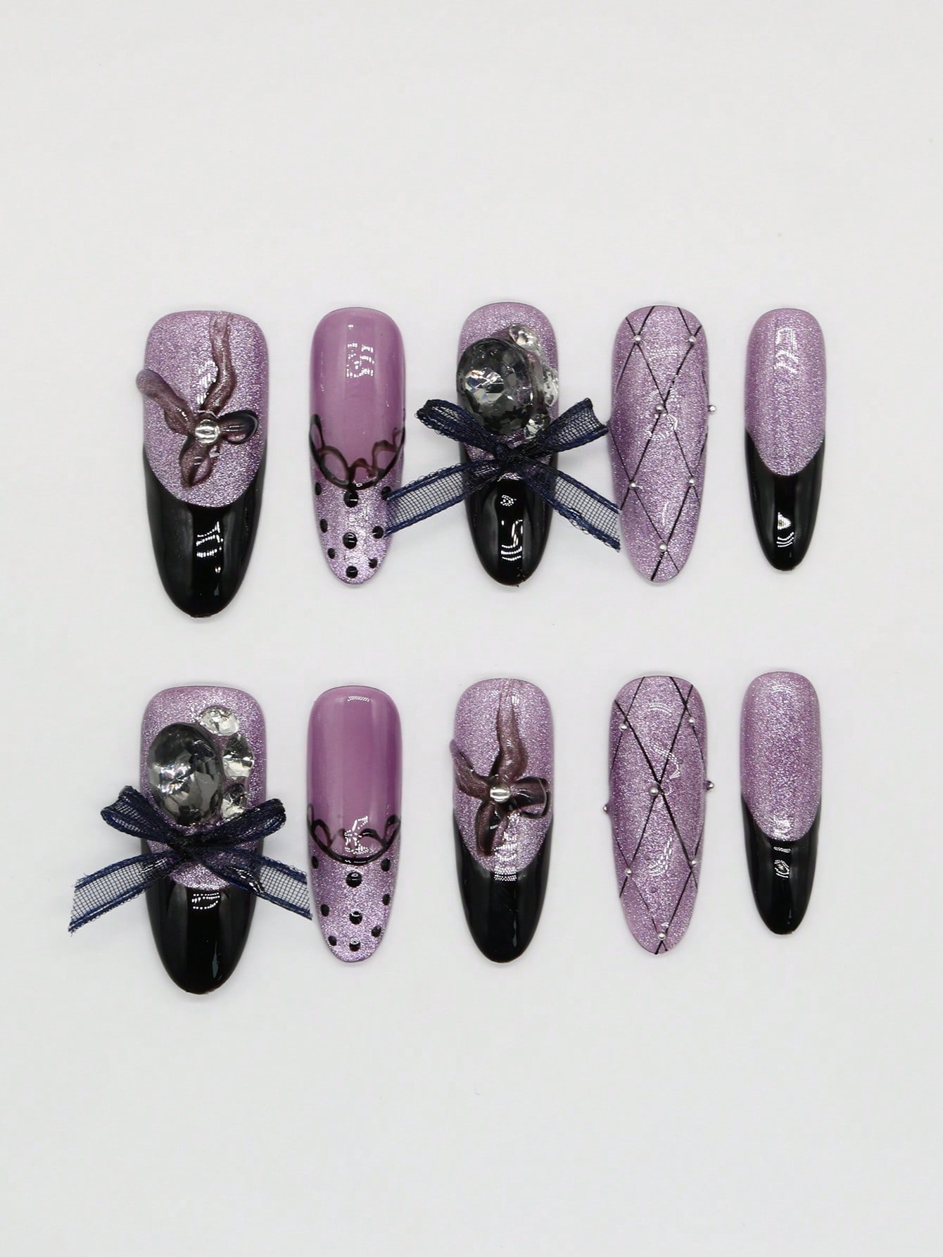 Fairycore 10pcs Y2K Style Butterfly Polka Dot Handmade False Nails + 3pcs 2-Sided Adhesive, Detachable French Diamond Grid Nail Art Stickers, High-Quality Rhinestone & Glitter Colorful Nail Decor, Suitable For Festivals, Parties, Dancing And Daily Wear