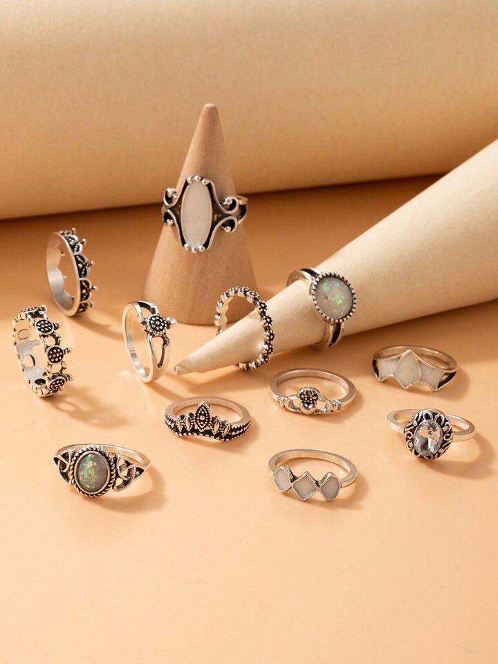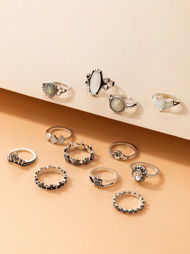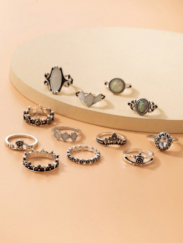 Fairycore 12pcs/Set Women's Fashionable Personalized Alloy Geometric Pattern Rhinestone Round Hollow Out Crown & Turtle Closed Rings For Party Gift