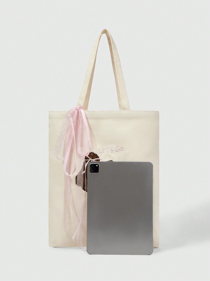 Fairycore 1pc 35*40cm Brown Denim Tote Bag For Women With Bowknot Decoration & Embroidery Pattern