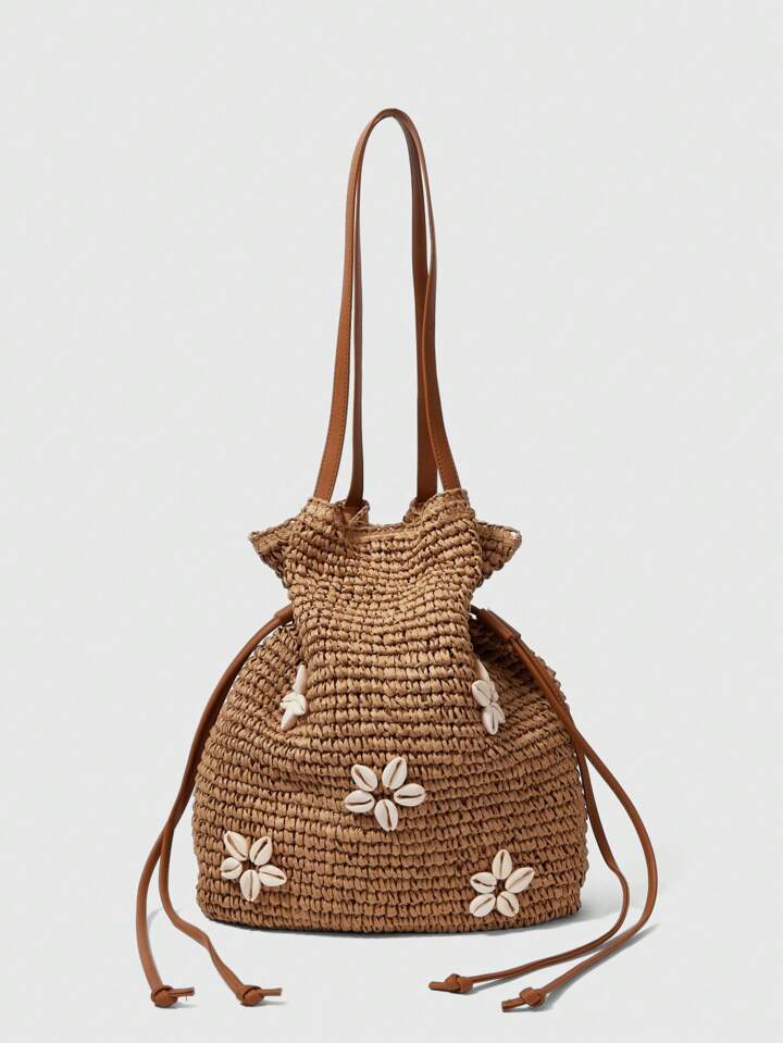 Fairycore 1pc Khaki Woven Raffia Tote Bag And Accessories, Fashionable Personalized Beach Resort Style Ladies Handbag
