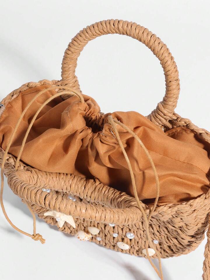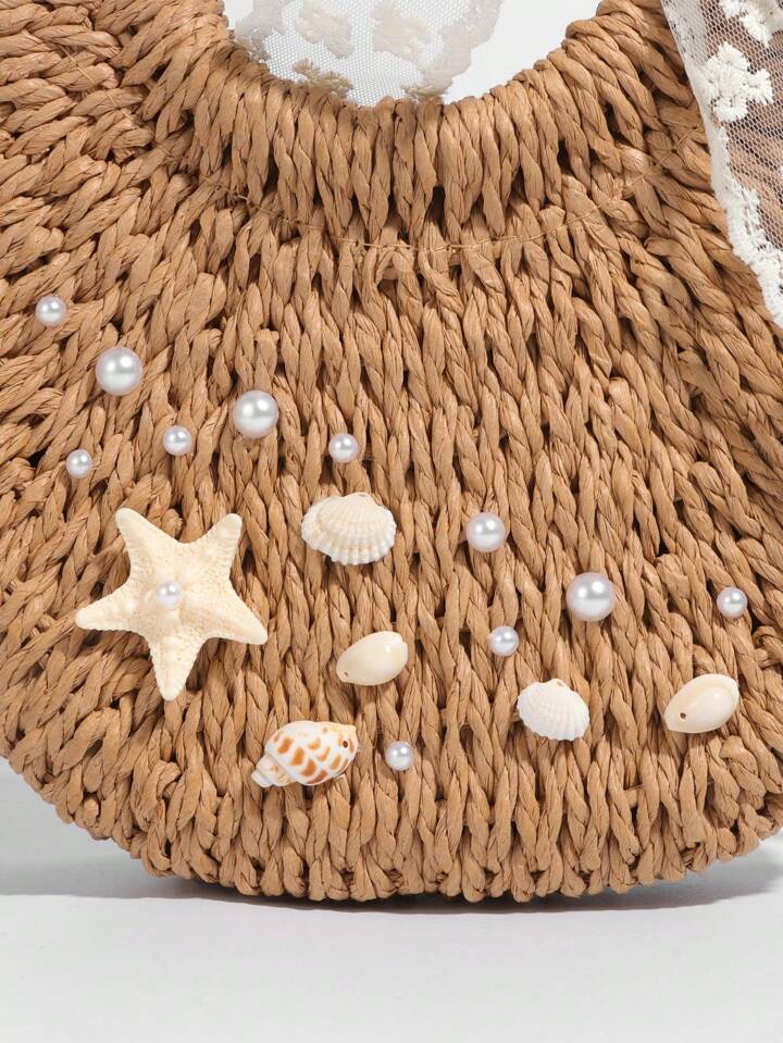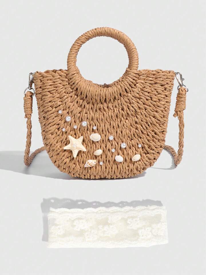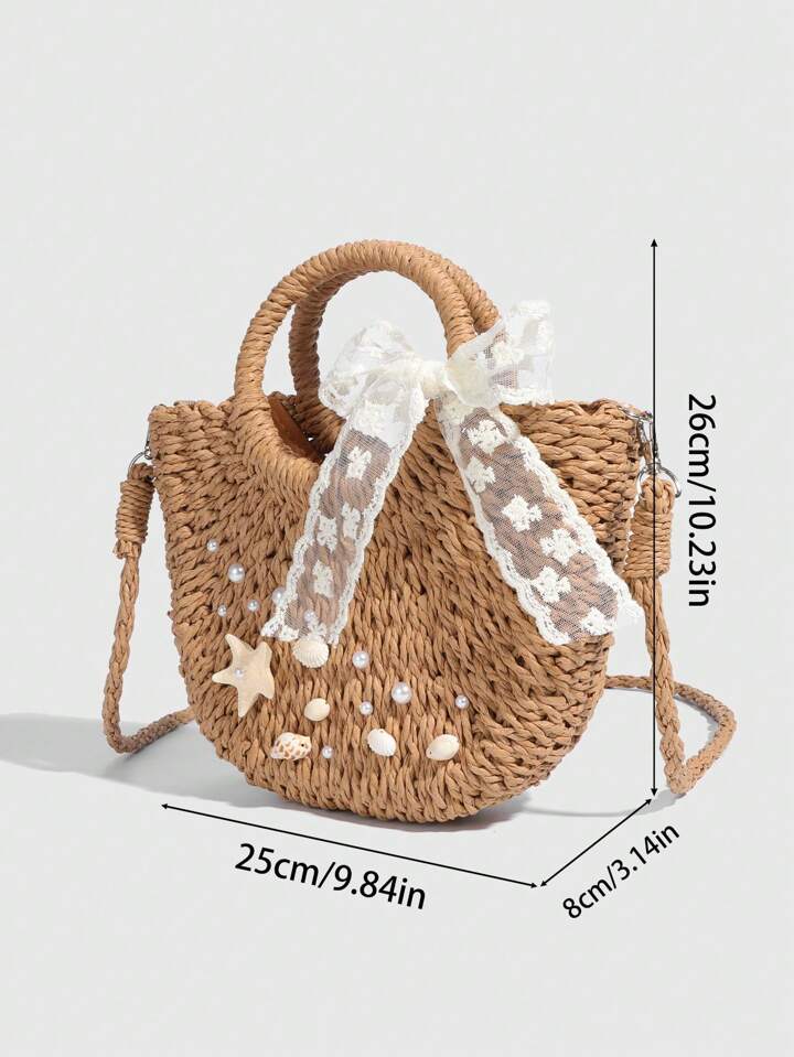 Fairycore 1pc Straw Beach Bag For Spring/Summer Vacation, Decorated With Starfish, Shell And Bow, Khaki Color Tote & Shoulder Bag For Women, Great Mother's Day Gift