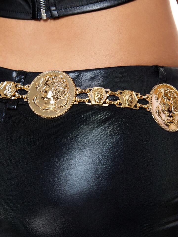 Fairycore 1pc Women's Golden Lady Head & Coin Decor Waist Chain For Dress, Versatile Daily Wear