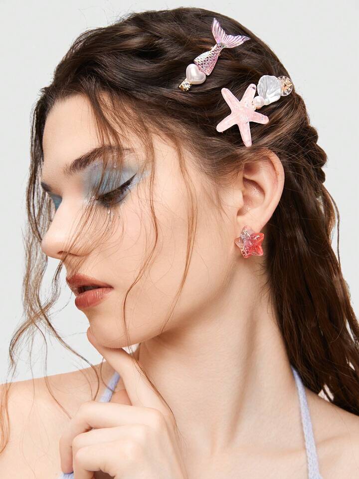 Fairycore 3pcs Random Style, INS Beach Style Hair Clips With Ocean Seashell, Gradient Sea Star And Mermaid Designs Embellished With Rhinestones, Chic Hairpin Bangs Accessories