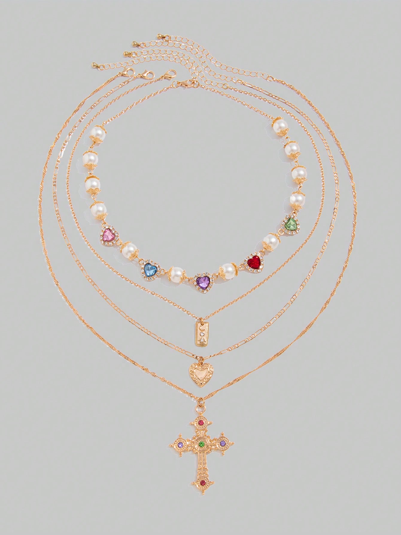 Fairycore 4pcs/Set Women Sweet & Cool Gem Heart, Faux-Pearl, Rhinestone Cross Layered Pendant Necklace Set