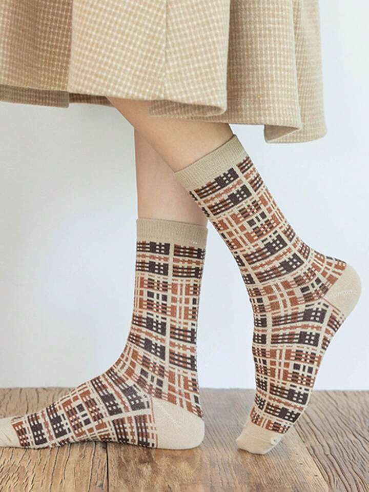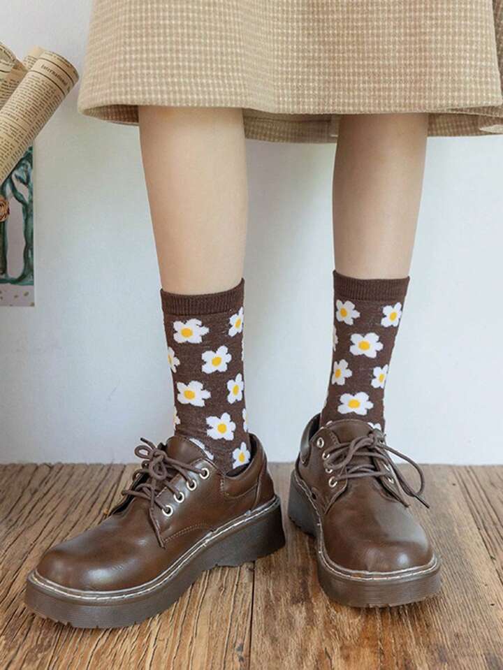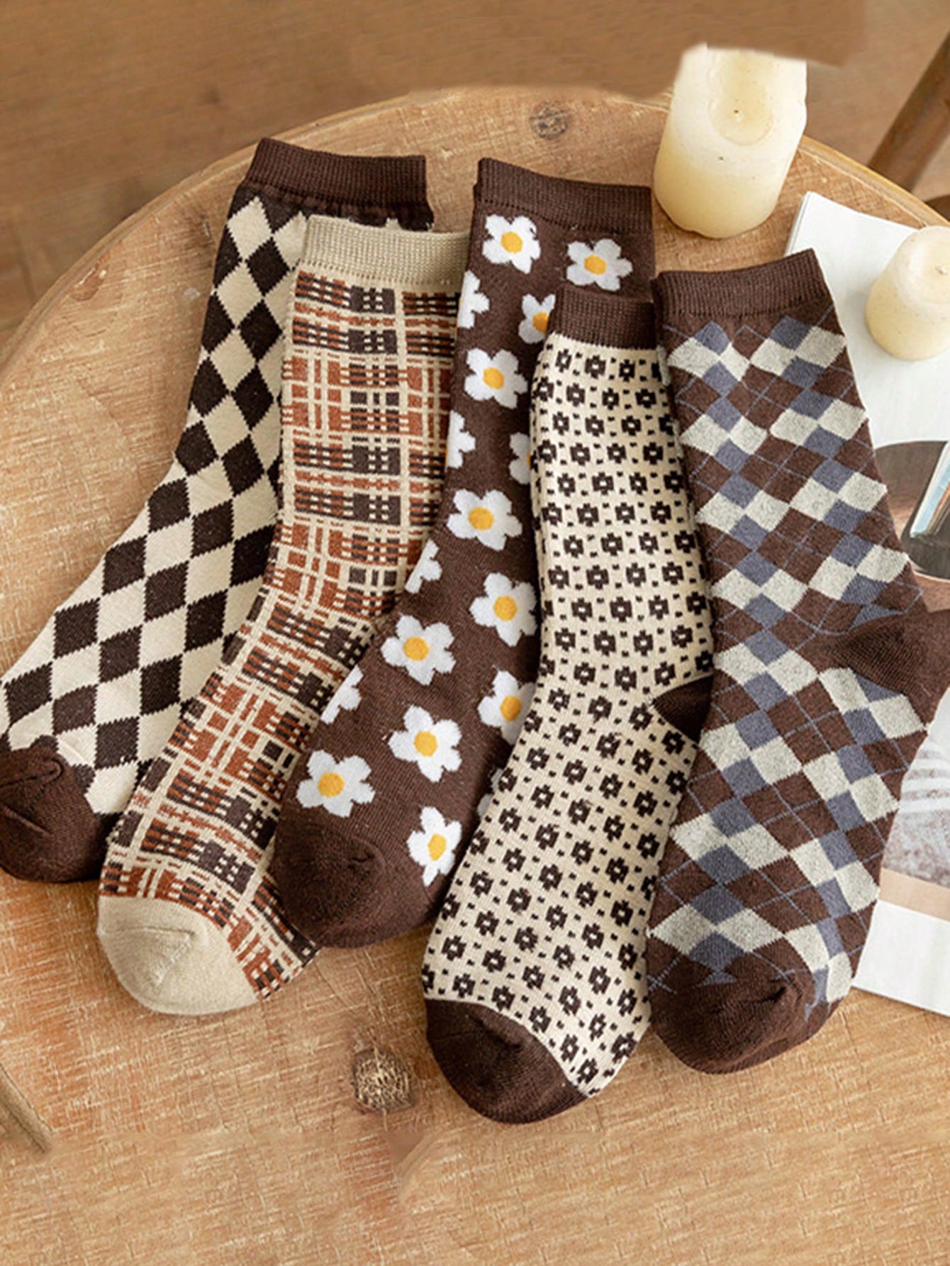 Fairycore 5pairs Floral & Plaid Pattern Crew Socks