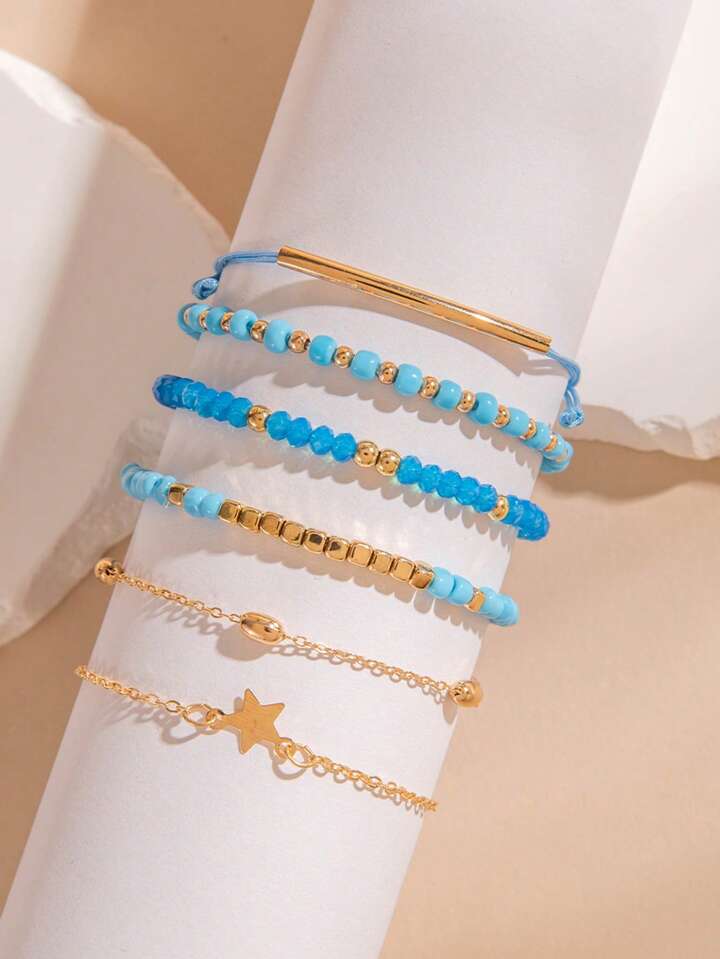 Fairycore 6pcs Set Beach Style Resin Light Blue Bead Star Pendant Rope Chain Metal Hollow Bracelet Set, Parties, Gifts