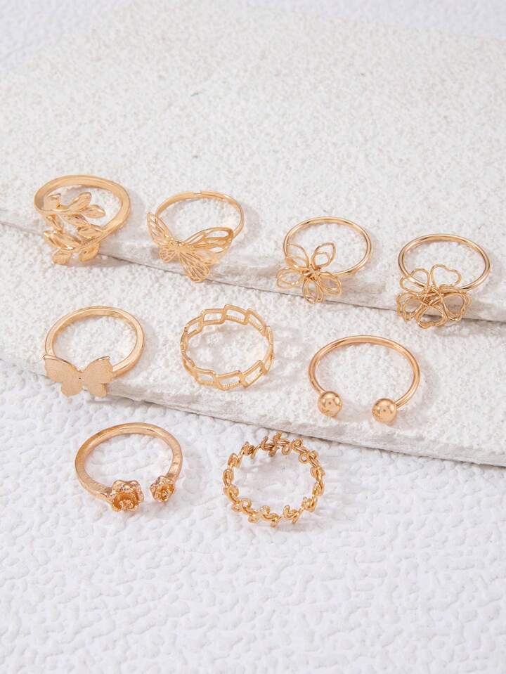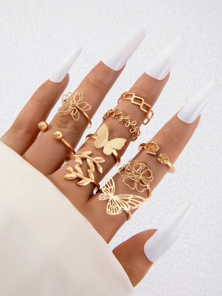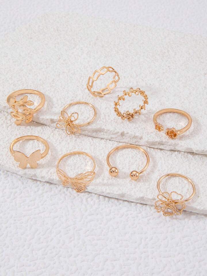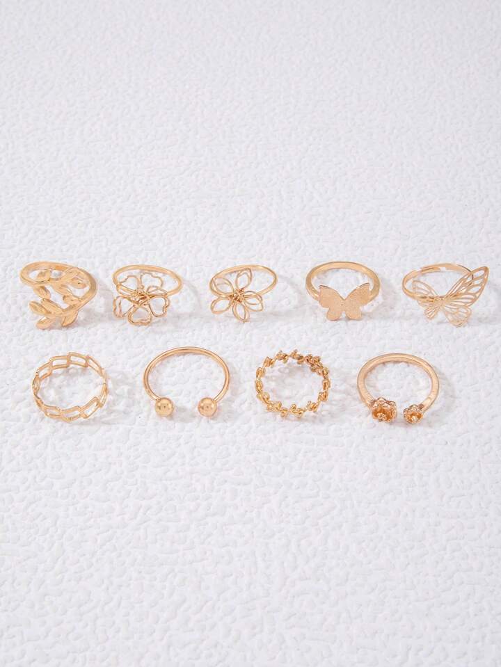Fairycore 9pcs/set Simple Alloy Leaf & Butterfly & Floral Shank Rings For Women's Daily Wear