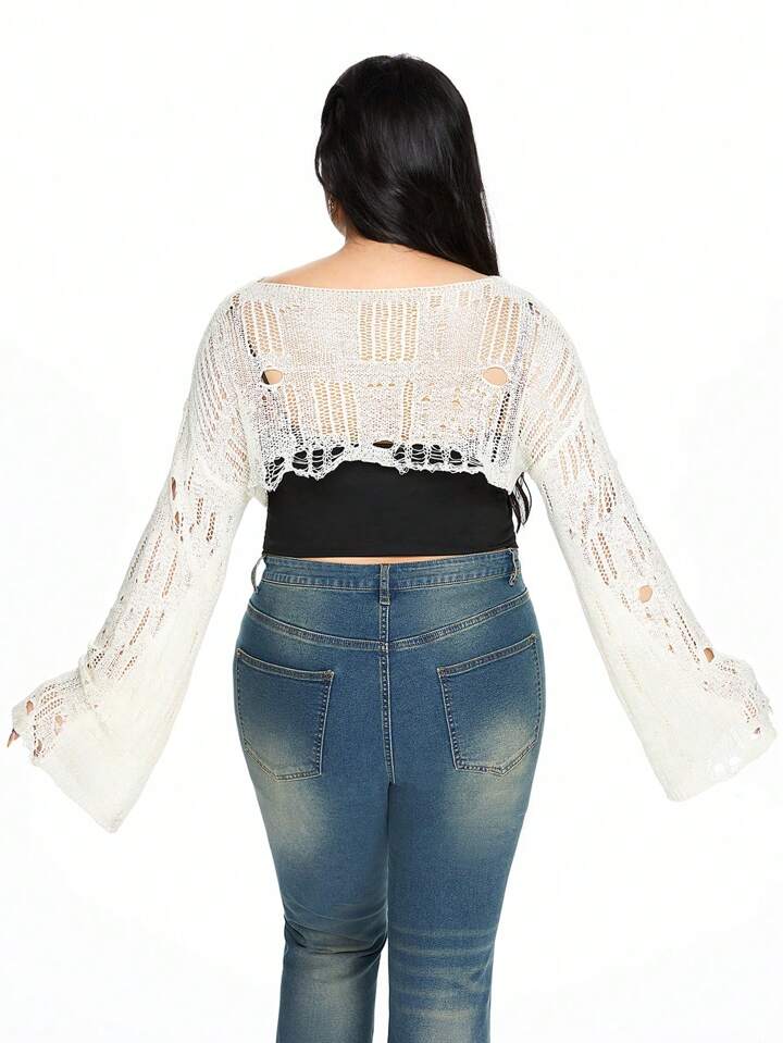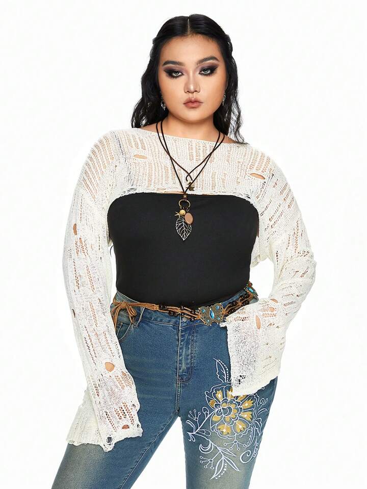 Fairycore Apricot Vintage Style Plus Size Shredded Flared Sleeve Sweater