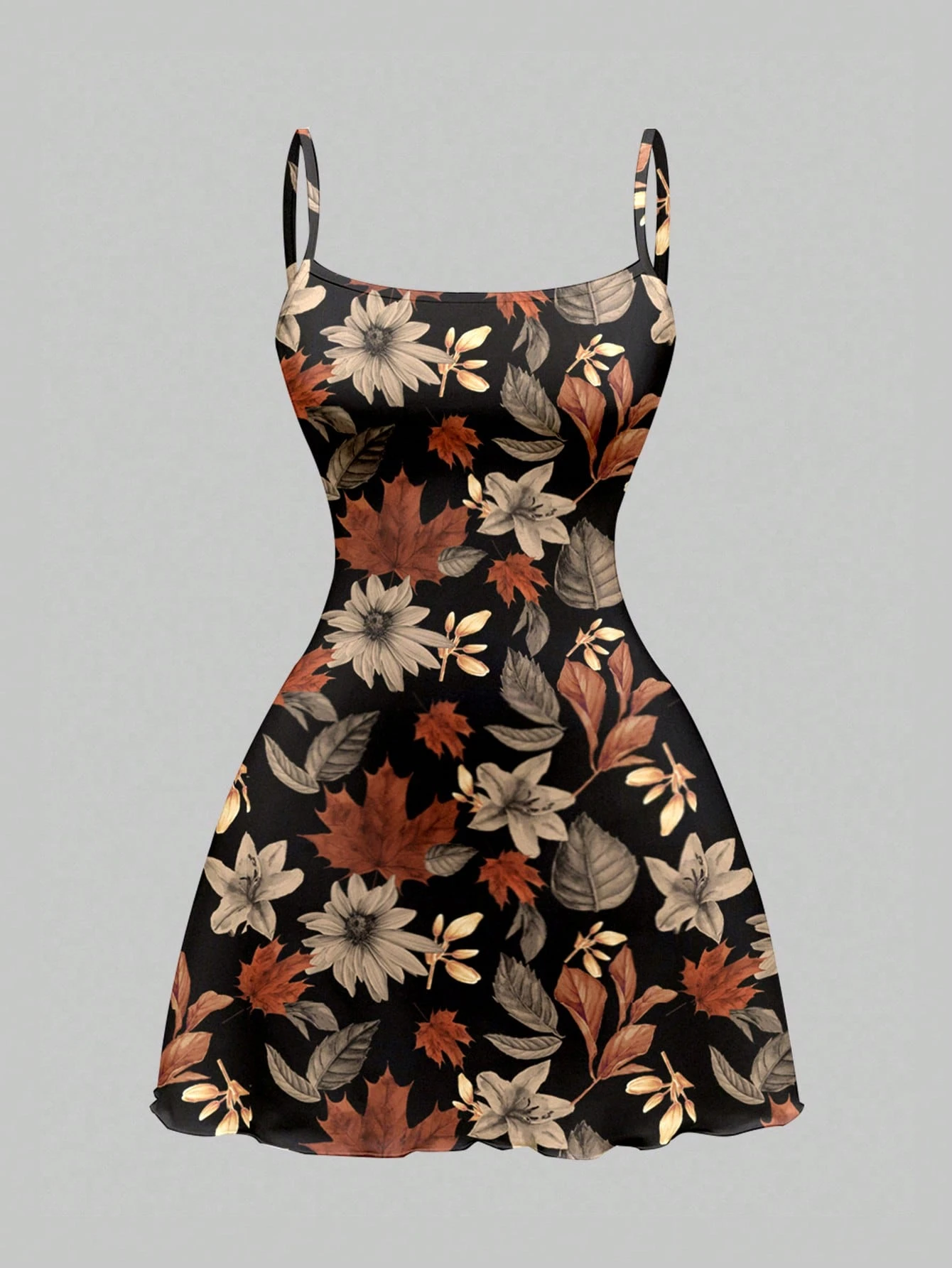 Fairycore Autumn Leaf & Floral Print Sexy Spaghetti Strap Low-Cut Mini Dress For Women, Autumn/Winter