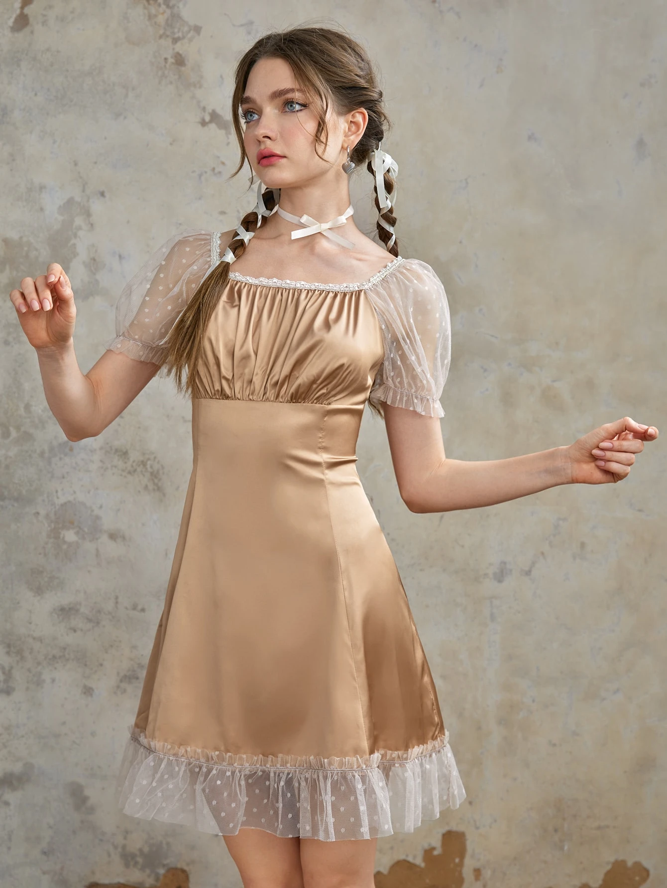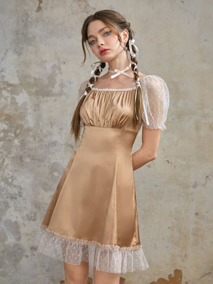 Fairycore Contrast Mesh Ruched Bust Ruffle Hem Dress