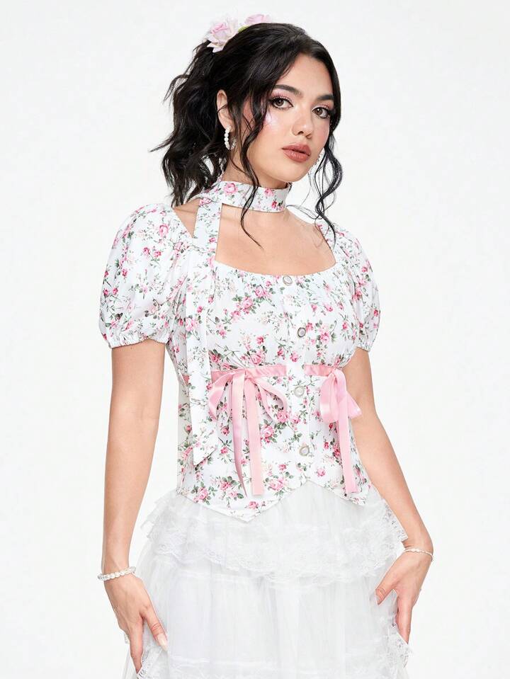 Fairycore Cute Sweet Ribbon Bow Decor Ditsy Ditsy Floral Women T-Shirt