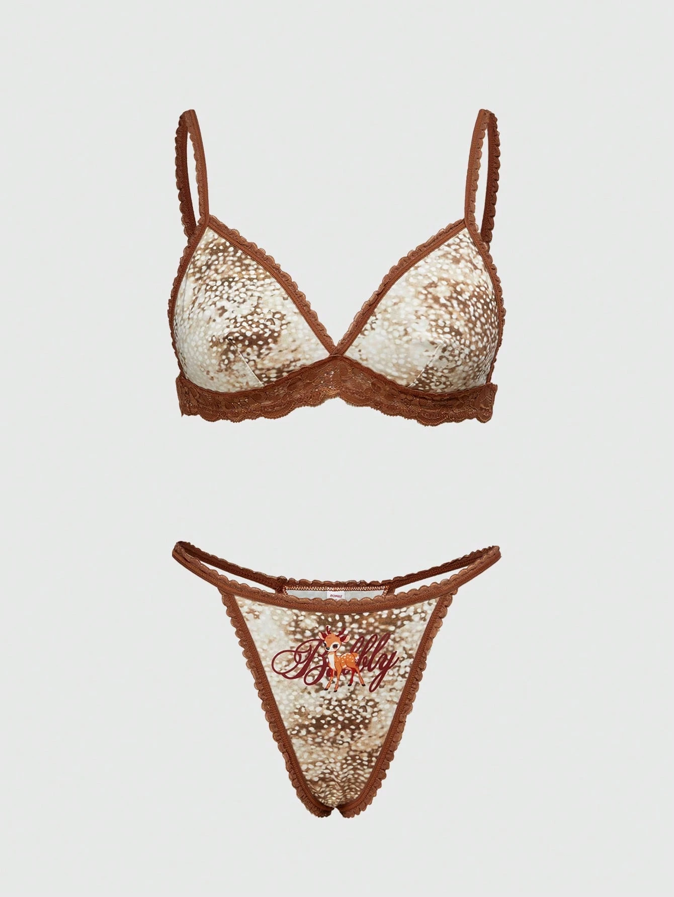 Fairycore Fairy Garden Deer Animal Print Lace Patchwork Wireless Lingerie Brassiere And Panty Set For Women