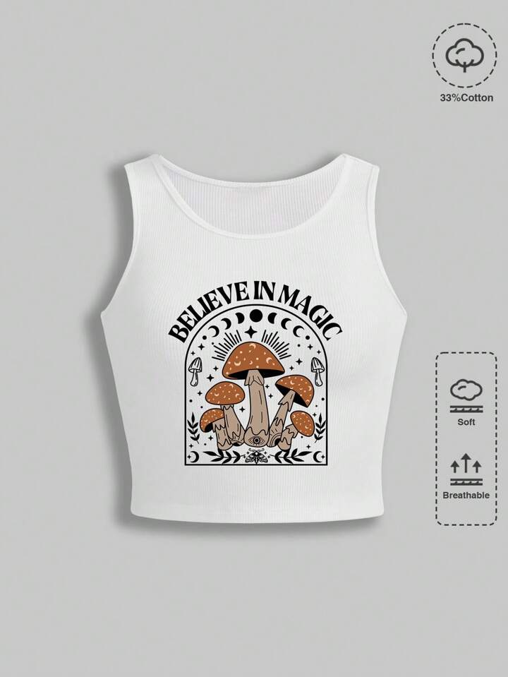 Fairycore Fairy Grunge Style Casual Plus Size Scoop Neck Rib-Knit Tight Waist Crop Tank Top With Mysterious Mushroom, Sun And Moon Pattern